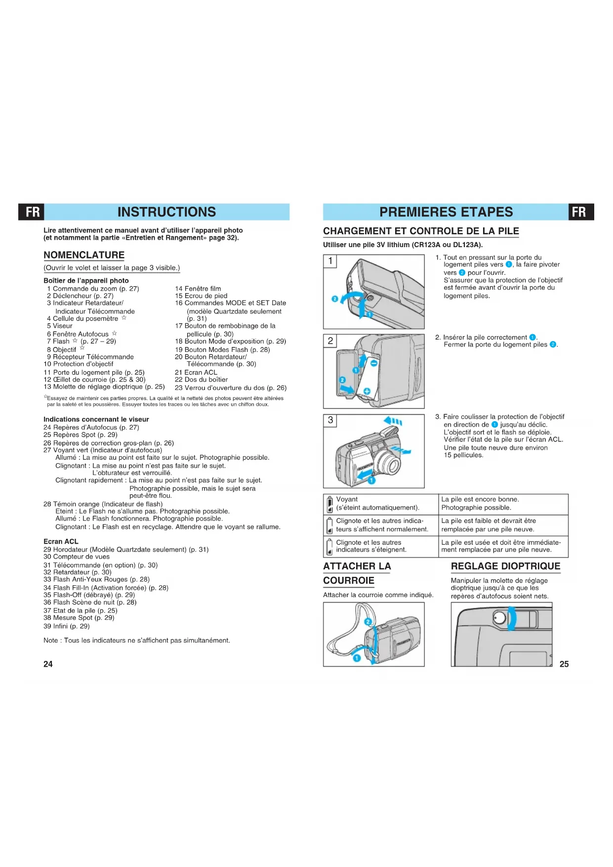 Essayez de maintenir ces parties propres. La qualité et la netteté des photos peuvent être altéréespar la saleté et les poussières. Essuyer toutes les traces ou les tâches avec un chiffon doux. Indications concernant le viseur 24 Repères d’Autofocus (p. 27) 25 Repères Spot (p. 29) 26 Repères de correction gros-plan (p. 26) 27 Voyant vert (Indicateur d’autofocus) Allumé : La mise au point est faite sur le sujet. Photographie possible. Clignotant : La mise au point n’est pas faite sur le sujet. L’obturateur est verrouillé. Clignotant rapidement : La mise au point n’est pas faite sur le sujet. Photographie possible, mais le sujet sera peut-être flou. 28 Témoin orange (Indicateur de flash) Eteint : Le Flash ne s’allume pas. Photographie possible. Allumé : Le Flash fonctionnera. Photographie possible. Clignotant : Le Flash est en recyclage. Attendre que le voyant se rallume. Ecran ACL 29 Horodateur (Modèle Quartzdate seulement) (p. 31) 30 Compteur de vues 31 Télécommande (en option) (p. 30) 32 Retardateur (p. 30) 33 Flash Anti-Yeux Rouges (p. 28) 34 Flash Fill-In (Activation forcée) (p. 28) 35 Flash-Off (débrayé) (p. 29) 36 Flash Scène de nuit (p. 28) 37 Etat de la pile (p. 25) 38 Mesure Spot (p. 29) 39 Infini (p. 29) Note : Tous les indicateurs ne s’affichent pas simultanément. 14 Fenêtre film 15 Ecrou de pied 16 Commandes MODE et SET Date (modèle Quartzdate seulement (p. 31) 17 Bouton de rembobinage de la pellicule (p. 30) 18 Bouton Mode d’exposition (p. 29) 19 Bouton Modes Flash (p. 28) 20 Bouton Retardateur/ Télécommande (p. 30) 21 Ecran ACL 22 Dos du boîtier 23 Verrou d’ouverture du dos (p. 26)PRENDRE DES PHOTOGRAPHIES FONCTIONS STANDARDS