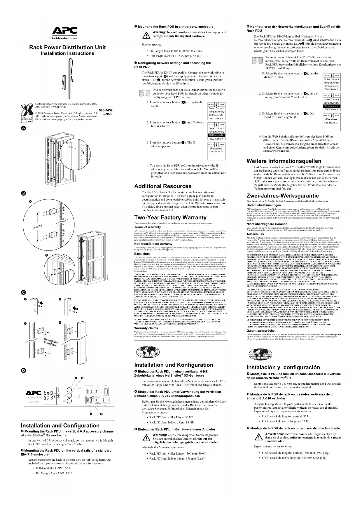 l'adresse IP dans le champ d'adresse de votre navigateur Web. Vous serez invité à entrer un nom d'utilisateur et un mot de passe. Saisissez la valeur par défaut apc pour chacun d'entre eux. Ressources supplémentaires Le Guide de l'utilisateur de la PDU à monter en rack contient des informations exhaustives sur le fonctionnement et la configuration. Le guide de l'utilisateur, ainsi que des documentations supplémentaires et des logiciels et des microprogrammes téléchargeables, est disponible sur la page produit concernée du site Web d'APC, www.apc.com. Pour trouver rapidement la page d'un produit, saisissez le nom du produit ou sa référence dans le champ de recherche. Garantie usine de deux ans Cette garantie s’applique uniquement aux produits que vous achetez pour une utilisation personnelle conforme aux instructions du présent manuel. Conditions de la garantie APC garantit que ses produits seront exempts de tout défaut dû au matériel ou à la fabrication pendant une période de deux ans à compter de la date d’achat. APC réparera ou remplacera tout produit défectueux couvert par la présente garantie. Cette garantie ne couvre pas les dommages résultant d’un accident, d’une négligence ou d’une mauvaise utilisation, ni d’une modification ou adaptation quelconque du produit. La réparation ou le remplacement d'un produit défectueux ou d'un de ses composants ne prolonge pas la période de garantie d'origine. Toute pièce fournie dans le cadre de cette garantie peut être neuve ou avoir été réusinée. Garantie non transférable Cette garantie ne s’applique qu’à l’acheteur d’origine qui doit avoir enregistré correctement le produit. Pour enregistrer le produit, visitez le site Web d'APC www.apc.com. Exclusions Dans le cadre de cette garantie, APC ne peut être tenu responsable si, après contrôle et examen effectué par APC, il s’avère que le produit n’est pas défectueux ou que le défaut présumé est la conséquence d'une mauvaise utilisation, d'une négligence, d'une mauvaise installation ou d'un mauvais contrôle de la part de l'acheteur ou d'un tiers. De plus, APC ne peut être tenu responsable dans le cadre de cette garantie en cas de tentative non autorisée de réparation ou de modification d'une connexion ou d'un voltage électrique incorrect ou inadapté, de conditions de fonctionnement sur site inappropriées, d'une atmosphère corrosive, de réparations, d'installation, d'exposition aux éléments naturels, de catastrophes naturelles, d'incendie, de vol ou d'installation contraire aux recommandations ou spécifications d'APC, ou quel que soit le cas si le numéro de série APC a été modifié, dégradé ou effacé ou de toute autre cause non survenue dans le cadre d'une utilisation autorisée.CE CONTRAT NE PRÉSENTE AUCUNE GARANTIE, EXPLICITE OU IMPLICITE, PAR EFFET DE LA LOI OU DE TOUTE AUTRE MANIÈRE, CONCERNANT LES PRODUITS VENDUS, RÉPARÉS OU FOURNIS. APC REJETTE TOUTE GARANTIE IMPLICITE DE COMMERCIABILITÉ, SATISFACTION OU ADÉQUATION À UN USAGE PARTICULIER. LES GARANTIES EXPLICITES D'APC NE PEUVENT ÊTRE ÉTENDUES, DIMINUÉES OU AFFECTÉES PAR LES CONSEILS OU SERVICES TECHNIQUES OU AUTRES OFFERTS PAR APC CONCERNANT LES PRODUITS, ET AUCUNE OBLIGATION OU RESPONSABILITÉ NE PEUT S'EN DÉGAGER. LES GARANTIES ET COMPENSATIONS CI-DESSUS SONT EXCLUSIVES ET REMPLACENT TOUTES LES AUTRES GARANTIES ET COMPENSATIONS. EN CAS DE NON-RESPECT DE CES GARANTIES, LA RESPONSABILITÉ D'APC ET LE RECOURS DE L'ACHETEUR SE LIMITENT AUX GARANTIES INDIQUÉES CI-DESSUS. LES GARANTIES OCTROYÉES PAR APC S'APPLIQUENT UNIQUEMENT À L'ACHETEUR ET NE SONT PAS TRANSFÉRABLES À UN TIERS. EN AUCUN CAS, APC, SES AGENTS, SES DIRECTEURS, SES FILIALES OU SES EMPLOYÉS NE POURRONT ÊTRE TENUS RESPONSABLES POUR TOUTE FORME DE DOMMAGES INDIRECTS, PARTICULIERS, IMMATÉRIELS OU EXEMPLAIRES, SUITE À L'UTILISATION, L'ENTRETIEN OU L'INSTALLATION DES PRODUITS, QUE CES DOMMAGES REVÊTENT UN CARACTÈRE CONTRACTUEL OU DÉLICTUEL, SANS TENIR COMPTE DES DÉFAUTS, DE LA NÉGLIGENCE OU DE LA RESPONSABILITÉ ABSOLUE, OU MÊME SI APC A ÉTÉ PRÉVENU DE L'ÉVENTUALITÉ DE TELS DOMMAGES. SPÉCIFIQUEMENT, APC N'EST RESPONSABLE D'AUCUN COÛT, TEL QUE LA PERTE DE PROFITS OU DE REVENUS, LA PERTE DE L'UTILISATION DE MATÉRIEL, DE LOGICIELS, DE DONNÉES, LE COÛT DE SUBSTITUTS, LES RÉCLAMATIONS PAR DES TIERS OU AUTRES.AUCUN REPRÉSENTANT, EMPLOYÉ OU AGENT D'APC N'EST AUTORISÉ À APPORTER DES ANNEXES OU DES MODIFICATIONS AUX CONDITIONS DE LA PRÉSENTE GARANTIE. LES CONDITIONS DE LA GARANTIE NE PEUVENT ÊTRE MODIFIÉES, LE CAS ÉCHÉANT, QUE PAR ÉCRIT ET AVEC LA SIGNATURE D'UN AGENT APC ET DU SERVICE JURIDIQUE. Réclamations Les Clients désirant effectuer une réclamation peuvent accéder au service d'assistance Clients d'APC en visitant la page Support du site Web d'APC à l'adresse www.apc.com/support. Sélectionnez votre pays dans le menu déroulant se trouvant en haut de la page Web. Sélectionnez l'onglet Support pour obtenir les coordonnées du service d'assistance clients dans votre région. Installazione e configurazione D Montaggio dell'unità di distribuzione dell'alimentazione in rack nel canale accessori 0 U di un armadietto NetShelter