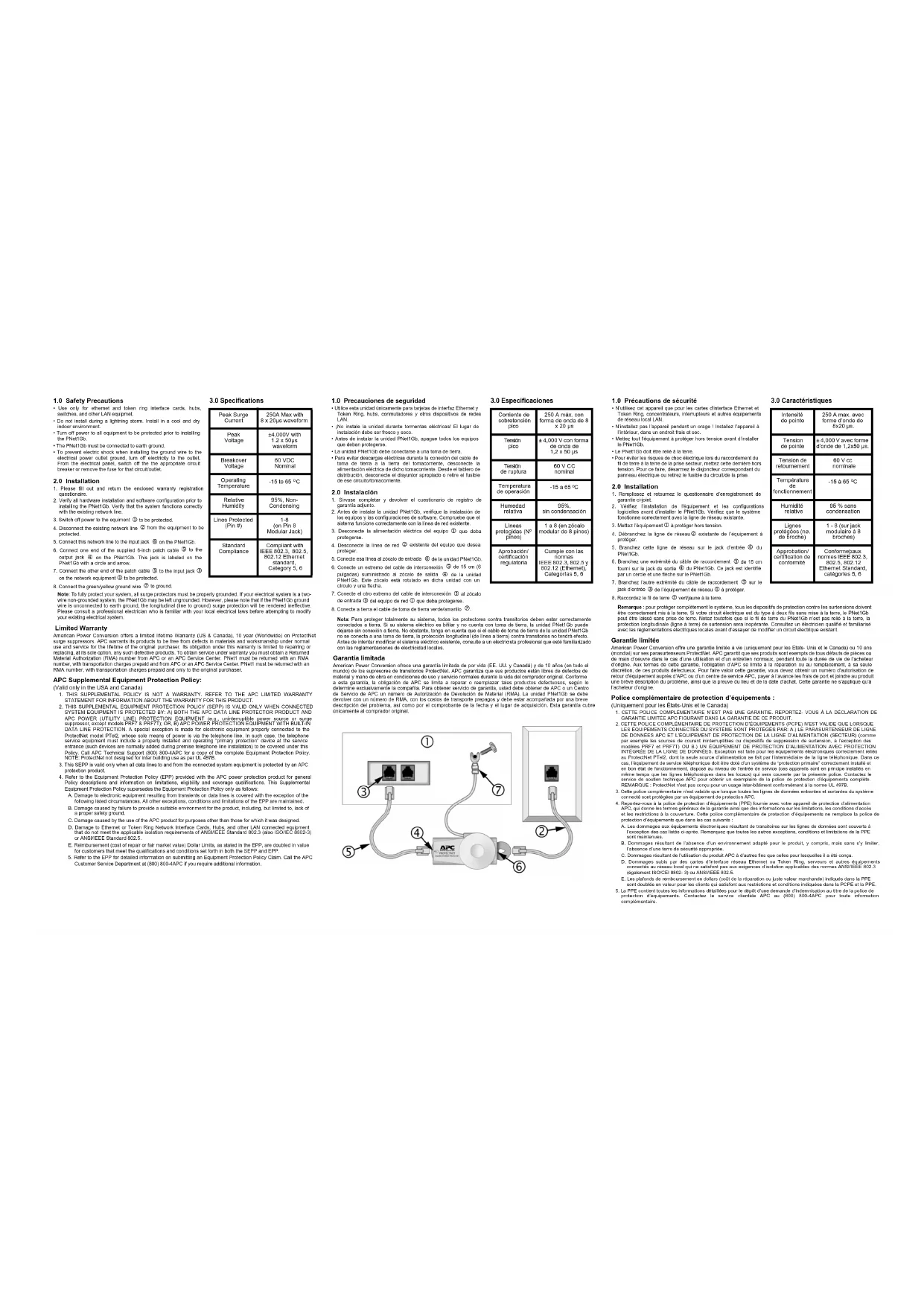 LES ÉQUIPEMENTS CONNECTÉS DU SYSTÈME SONT PROTÉGÉS PAR: A.) LE PARASURTENSEUR DE LIGNEDE DONNÉES APC ET L'ÉQUIPEMENT DE PROTECTION DE LA LIGNE D’ALIMENTATION (SECTEUR) (commepar exemple les sources de courant ininterruptibles ou dispositifs de suppression de surtension, à l’exception desmodèles PRF7 et PRF7T) OU B.) UN ÉQUIPEMENT DE PROTECTION D’ALIMENTATION AVEC PROTECTIONINTÉGRÉE DE LA LIGNE DE DONNÉES. Exception est faite pour les équipements électroniques correctement reliésau ProtectNet PTel2, dont la seule source d’alimentation se fait par l’intermédiaire de la ligne téléphonique. Dans cecas, l’équipement de service téléphonique doit être doté d’un système de “protection primaire” correctement installé eten bon état de fonctionnement, disposé au niveau de l’entrée de service (ces appareils sont en principe installés enmême temps que les lignes téléphoniques dans les locaux) qui sera couverte par la présente police. Contactez leservice de soutien technique APC pour obtenir un exemplaire de la police de protection d’équipements complète.REMARQUE : ProtectNet n'est pas conçu pour un usage inter-bâtiment conformément à la norme UL 497B.