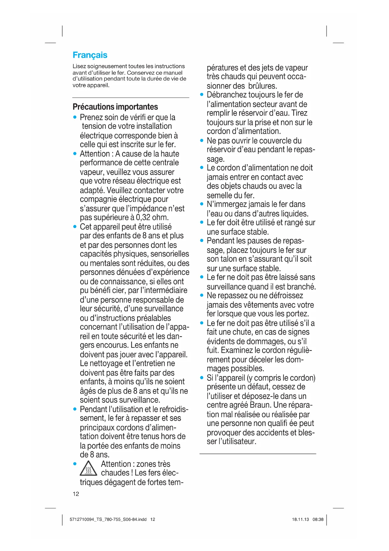 Si l’appareil (y compris le cordon) présente un défaut, cessez de l’utiliser et déposez-le dans un centre agréé Braun. Une répara- tion mal réalisée ou réalisée par une personne non qualifi ée peut provoquer des accidents et bles- ser l’utilisateur. 5712710094_TS_780-755_S06-84.indd 125712710094_TS_780-755_S06-84.indd 12 18.11.13 08:3818.11.13 08:3813 A Description 1 Jet de vapeur 2 Jet du spray 3 Ouverture du réservoir d’eau 4 Bouton de la fonction precision shot 5 Bouton Spray 6 Régulateur de vapeur 7 Sélectionneur de température 8 Témoin lumineux du niveau de la température 9 Témoin lumineux d’arrêt automatique 10 Talon repose-fer 11 Fonction Textile Protector 12 Fonction Soft Textile Protector B Avant utilisation Ce fer est conçu pour fonctionner avec de l’eau du robinet. Cependant, si votre eau contient beaucoup de calcaire, nous vous recommandons d’utiliser un mélange de 50 % d’eau du robinet et de 50 % d’eau distillée. Remplissez le réservoir jusqu’au niveau « max ». N’utilisez jamais d’eau distillée seule. Ne pas ajouter d’autres produits chimiques (comme l’amidon par exemple). Ne pas utiliser d’eau de condensation provenant d’un sèche- linge.
