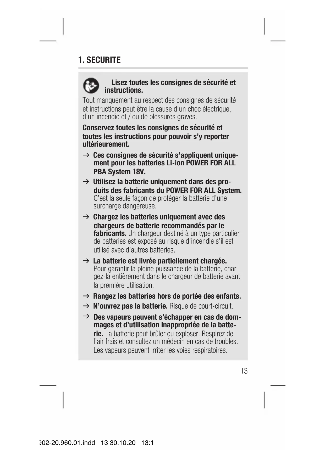 14902-20.960.01.indd 12 30.10.20 13:191. SECURITE Lisez toutes les consignes de sécurité et instructions. Tout manquement au respect des consignes de sécurité et instructions peut être la cause d’un choc électrique, d’un incendie et / ou de blessures graves. Conservez toutes les consignes de sécurité et toutes les instructions pour pouvoir s’y reporter ultérieurement. v Ces consignes de sécurité s’appliquent unique- ment pour les batteries Li-ion POWER FOR ALL PBA System 18V. v Utilisez la batterie uniquement dans des pro- duits des fabricants du POWER FOR ALL System. C’est la seule façon de protéger la batterie d’une surcharge dangereuse. v Chargez les batteries uniquement avec des chargeurs de batterie recommandés par le fabricants. Un chargeur destiné à un type particulier de batteries est exposé au risque d’incendie s’il est utilisé avec d’autres batteries. v La batterie est livrée partiellement chargée. Pour garantir la pleine puissance de la batterie, char- gez-la entièrement dans le chargeur de batterie avant la première utilisation. v Rangez les batteries hors de portée des enfants. v N’ouvrez pas la batterie. Risque de court-circuit.