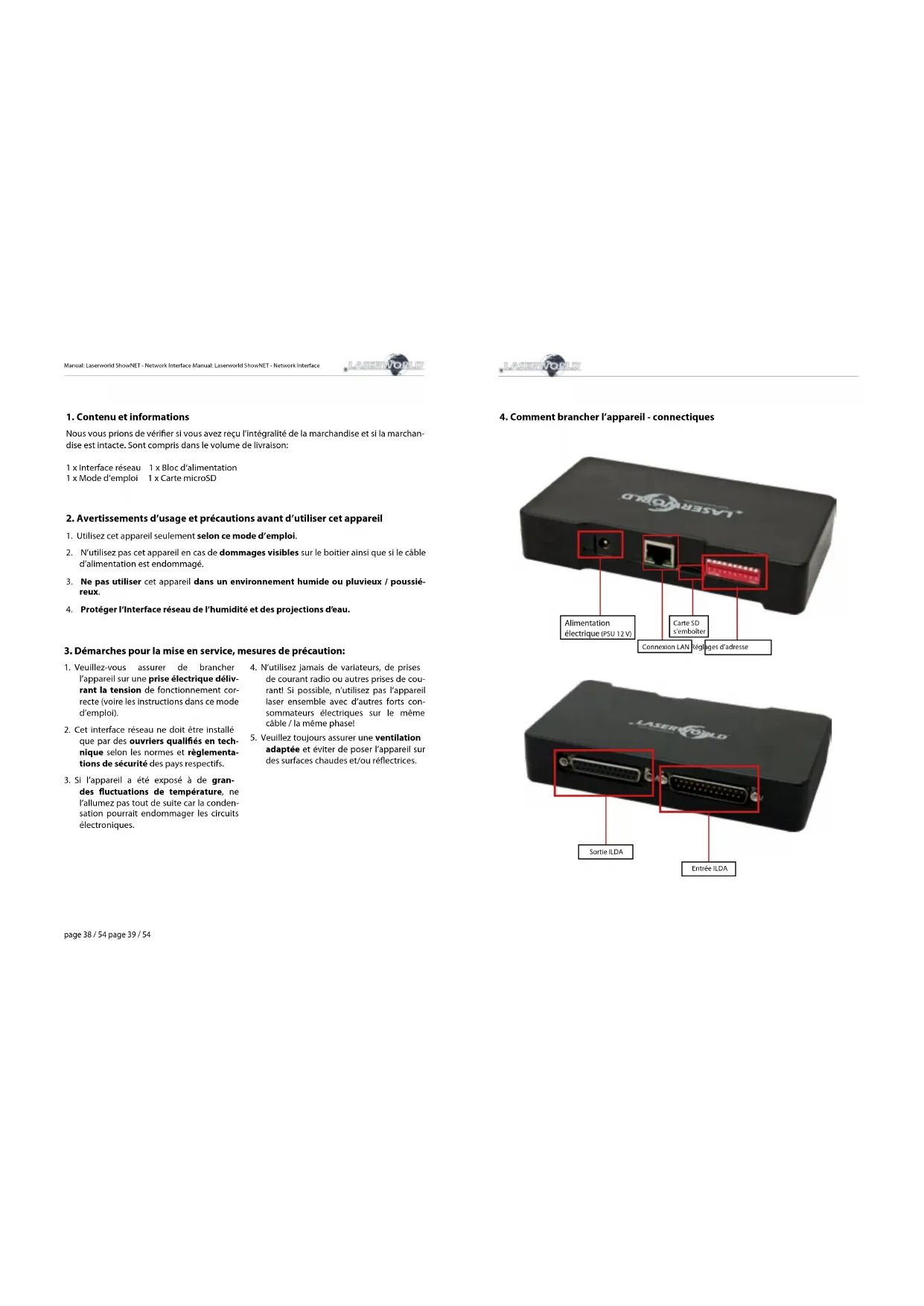 Manual / Bedienungsanleitung / Mode d‘emploi Laserworld ShowNET Network Interface Please read this manual carefully prior to product operation! Bitte lesen Sie diese Bedienungsanleitung vor Inbetriebnahme des Produkts! Avant d’utiliser cet appareil pour la première fois nous vous recommandons de lire cette notice d’utilisation! 05/2019 English Deutsch FrançaisManual: Laserworld ShowNET - Network Interface Manual: Laserworld ShowNET - Network Interface page 2 / 54 page 3 / 54 Rechtlicher Hinweis: Die Firma Laserworld (Switzerland) AG behält sich das Recht vor, Änderungen an ihren Pro- dukten vorzunehmen, die der technischen Weiterentwicklung dienen. Diese Änderungen werden nicht notwendigerweise in jedem Einzelfall dokumentiert. Diese Betriebsanleitung und die darin enthaltenen Informationen wurden mit der gebote- nen Sorgfalt zusammengestellt. Die Firma Laserworld AG übernimmt jedoch keine Gewähr für Druckfehler, andere Fehler oder daraus entstehende Schäden. Die in dieser Bedienungsanleitung genannten Marken und Produktnamen sind Warenzeichen oder eingetragene Warenzeichen der jeweiligen Titelhalter. Legal notice: Laserworld (Switzerland) AG reserves the right to make modications to its products, atten- ding to further technical developments. These modications do not necessarily have to be recorded in each case. This manual and its information have been made with due care. Laserworld AG cannot, howe- ver, take any responsibility for errata, bugs, or the resulting damages. The brands and product names mentioned in this manual are trade marks or registered trade marks of their respective owners. Information juridique : L’entreprise Laserworld (Switzerland) AG se réserve le droit d’eectuer des modications con- cernant leurs produits et ainsi de répondre au développement technique. Ces modications ne seront pas nécessairement annoncées en tout cas spécique. Ce mode d’emploi et les in- formations contenues dedans ont été établis avec le soin minutieux qui s’impose dans ce cas. Laserworld (Switzerland) AG ne pourra pas être tenue responsable pour d’éventuelles erreurs d’impression ou dommages en résultants. En cas de doutes, veuillez toujours contacter Laserworld (Switzerland) AG . Les noms de marques et de produits utilisés dans ce mode d’emploi sont des marques de fabrique ou des marques déposées. L’utilisation est réservée à un usage professionnel selon décret n°2007-665 du 2 mai 2007 relatif à la sécurité des appareils à laser sortant! Article 4 bis : « Les usages spéciques autorisés pour les appareils à laser sortant d’une classe supérieure à 2 sont les usages professionnels suivants :