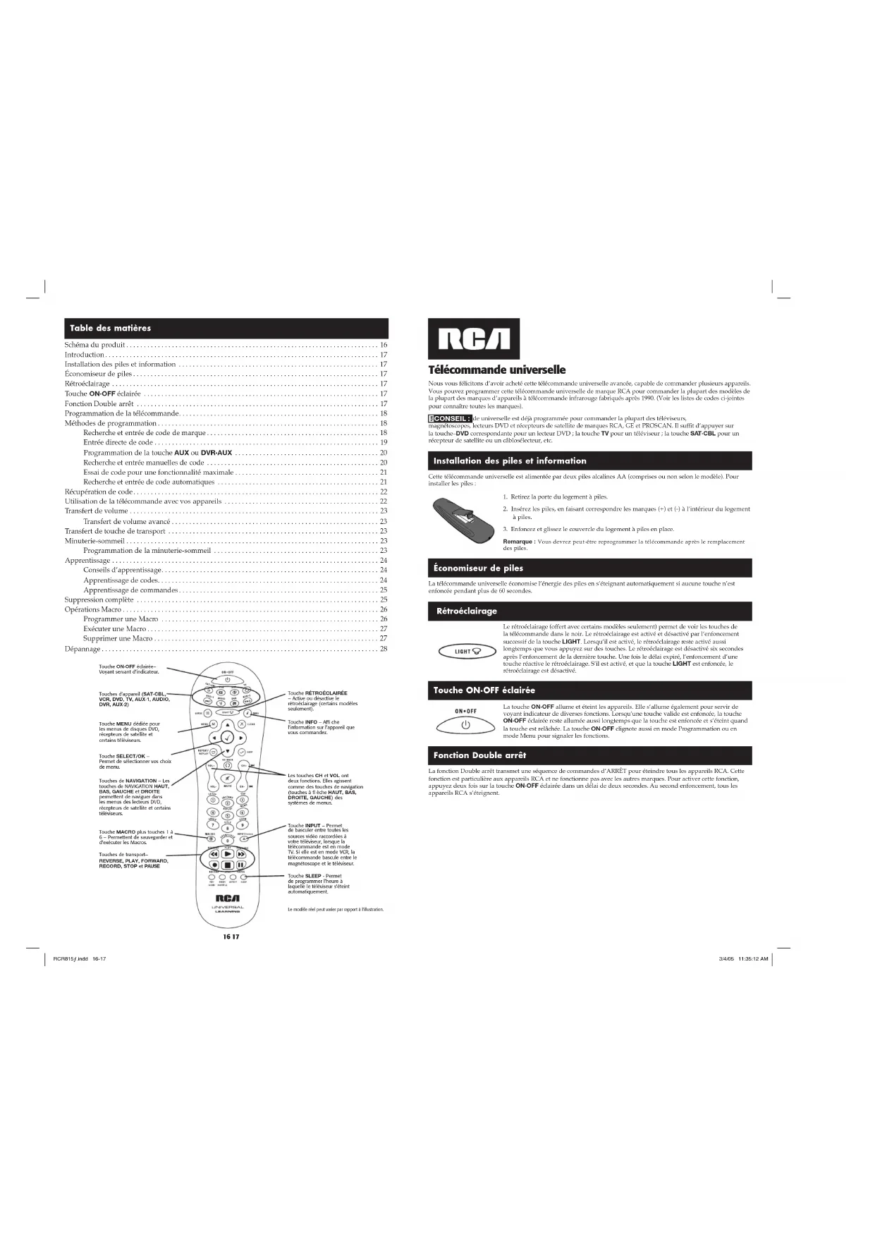 - The original remote may not be compatible with the Learning procedure. For more information, please visit www.rca.com Troubleshooting RCR815ƒ.indd 14-15RCR815ƒ.indd 14-15 3/4/05 11:35:12 AM3/4/05 11:35:12 AM16 17 Table des matières Touches d’appareil (SAT·CBL, VCR, DVD, TV, AUX·1, AUDIO, DVR, AUX·2) Touche RÉTROÉCLAIRÉE – Active ou désactive le rétroéclairage (certains modèles seulement).Touche ON·OFF éclairée– Voyant servant d’indicateur.Touches de transport– REVERSE, PLAY, FORWARD, RECORD, STOP et PAUSE Les touches CH et VOL ont deux fonctions. Elles agissent comme des touches de navigation (touches à fl èche HAUT, BAS, DROITE, GAUCHE) des systèmes de menus.Touches de NAVIGATION – Les touches de NAVIGATION HAUT, BAS, GAUCHE et DROITE permettent de naviguer dans les menus des lecteurs DVD, récepteurs de satellite et certains téléviseurs.Touche SELECT/OK – Permet de sélectionner vos choix de menu.Touche MENU dédiée pour les menus de disques DVD, récepteurs de satellite et certains téléviseurs.Touche SLEEP - Permet de programmer l’heure à laquelle le téléviseur s’éteint automatiquement.Touche INPUT – Permet de basculer entre toutes les sources vidéo raccordées à votre téléviseur, lorsque la télécommande est en mode TV. Si elle est en mode VCR, la télécommande bascule entre le magnétoscope et le téléviseur.Touche INFO – Affi che l’information sur l’appareil que vous commandez.Touche MACRO plus touches 1 à 6 – Permettent de sauvegarder et d’exécuter les Macros.Le modèle réel peut varier par rapport à l’illustration. Schéma du produit . . . . . . . . . . . . . . . . . . . . . . . . . . . . . . . . . . . . . . . . . . . . . . . . . . . . . . . . . . . . . . . . . . . . . . . . 16 Introduction . . . . . . . . . . . . . . . . . . . . . . . . . . . . . . . . . . . . . . . . . . . . . . . . . . . . . . . . . . . . . . . . . . . . . . . . . . . . . . 17 Installation des piles et information . . . . . . . . . . . . . . . . . . . . . . . . . . . . . . . . . . . . . . . . . . . . . . . . . . . . . . . . . 17 Économiseur de piles . . . . . . . . . . . . . . . . . . . . . . . . . . . . . . . . . . . . . . . . . . . . . . . . . . . . . . . . . . . . . . . . . . . . . . 17 Rétroéclairage . . . . . . . . . . . . . . . . . . . . . . . . . . . . . . . . . . . . . . . . . . . . . . . . . . . . . . . . . . . . . . . . . . . . . . . . . . . . 17 Touche ON·OFF éclairée . . . . . . . . . . . . . . . . . . . . . . . . . . . . . . . . . . . . . . . . . . . . . . . . . . . . . . . . . . . . . . . . . . . 17 Fonction Double arrêt . . . . . . . . . . . . . . . . . . . . . . . . . . . . . . . . . . . . . . . . . . . . . . . . . . . . . . . . . . . . . . . . . . . . . 17 Programmation de la télécommande. . . . . . . . . . . . . . . . . . . . . . . . . . . . . . . . . . . . . . . . . . . . . . . . . . . . . . . . . 18 Méthodes de programmation . . . . . . . . . . . . . . . . . . . . . . . . . . . . . . . . . . . . . . . . . . . . . . . . . . . . . . . . . . . . . . . 18 Recherche et entrée de code de marque . . . . . . . . . . . . . . . . . . . . . . . . . . . . . . . . . . . . . . . . . . . . . . . . . 18 Entrée directe de code . . . . . . . . . . . . . . . . . . . . . . . . . . . . . . . . . . . . . . . . . . . . . . . . . . . . . . . . . . . . . . . . 19 Programmation de la touche AUX ou DVR·AUX . . . . . . . . . . . . . . . . . . . . . . . . . . . . . . . . . . . . . . . . . 20 Recherche et entrée manuelles de code . . . . . . . . . . . . . . . . . . . . . . . . . . . . . . . . . . . . . . . . . . . . . . . . . 20 Essai de code pour une fonctionnalité maximale . . . . . . . . . . . . . . . . . . . . . . . . . . . . . . . . . . . . . . . . . 21 Recherche et entrée de code automatiques . . . . . . . . . . . . . . . . . . . . . . . . . . . . . . . . . . . . . . . . . . . . . . 21 Récupération de code. . . . . . . . . . . . . . . . . . . . . . . . . . . . . . . . . . . . . . . . . . . . . . . . . . . . . . . . . . . . . . . . . . . . . . 22 Utilisation de la télécommande avec vos appareils . . . . . . . . . . . . . . . . . . . . . . . . . . . . . . . . . . . . . . . . . . . . 22 Transfert de volume . . . . . . . . . . . . . . . . . . . . . . . . . . . . . . . . . . . . . . . . . . . . . . . . . . . . . . . . . . . . . . . . . . . . . . . 23 Transfert de volume avancé . . . . . . . . . . . . . . . . . . . . . . . . . . . . . . . . . . . . . . . . . . . . . . . . . . . . . . . . . . . 23 Transfert de touche de transport . . . . . . . . . . . . . . . . . . . . . . . . . . . . . . . . . . . . . . . . . . . . . . . . . . . . . . . . . . . . 23 Minuterie-sommeil . . . . . . . . . . . . . . . . . . . . . . . . . . . . . . . . . . . . . . . . . . . . . . . . . . . . . . . . . . . . . . . . . . . . . . . . 23 Programmation de la minuterie-sommeil . . . . . . . . . . . . . . . . . . . . . . . . . . . . . . . . . . . . . . . . . . . . . . . 23 Apprentissage . . . . . . . . . . . . . . . . . . . . . . . . . . . . . . . . . . . . . . . . . . . . . . . . . . . . . . . . . . . . . . . . . . . . . . . . . . . . 24 Conseils d’apprentissage. . . . . . . . . . . . . . . . . . . . . . . . . . . . . . . . . . . . . . . . . . . . . . . . . . . . . . . . . . . . . . 24 Apprentissage de codes. . . . . . . . . . . . . . . . . . . . . . . . . . . . . . . . . . . . . . . . . . . . . . . . . . . . . . . . . . . . . . . 24 Apprentissage de commandes . . . . . . . . . . . . . . . . . . . . . . . . . . . . . . . . . . . . . . . . . . . . . . . . . . . . . . . . . 25 Suppression complète . . . . . . . . . . . . . . . . . . . . . . . . . . . . . . . . . . . . . . . . . . . . . . . . . . . . . . . . . . . . . . . . . . . . . 25 Opérations Macro . . . . . . . . . . . . . . . . . . . . . . . . . . . . . . . . . . . . . . . . . . . . . . . . . . . . . . . . . . . . . . . . . . . . . . . . . 26 Programmer une Macro . . . . . . . . . . . . . . . . . .