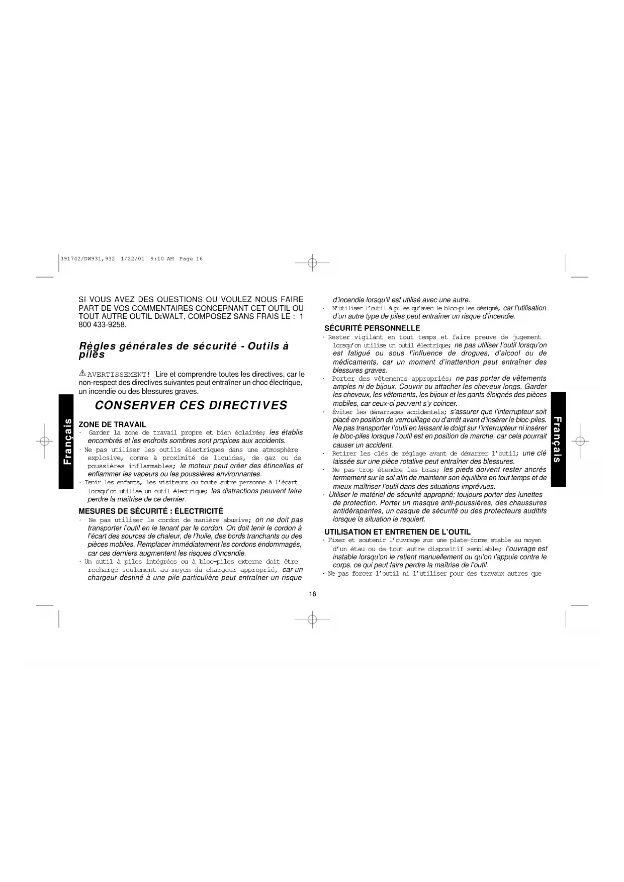 - Ne pas forcer l’outil ni l’utiliser pour des travaux autres que 391742/DW931,932 1/22/01 9:10 AM Page 1617 Français ceux pour lesquels il a été conçu. Pour obtenir de meilleurs résultats et prévenir les risques de blessure, laisser l’outil couper à la vitesse pour laquelle il a été conçu.