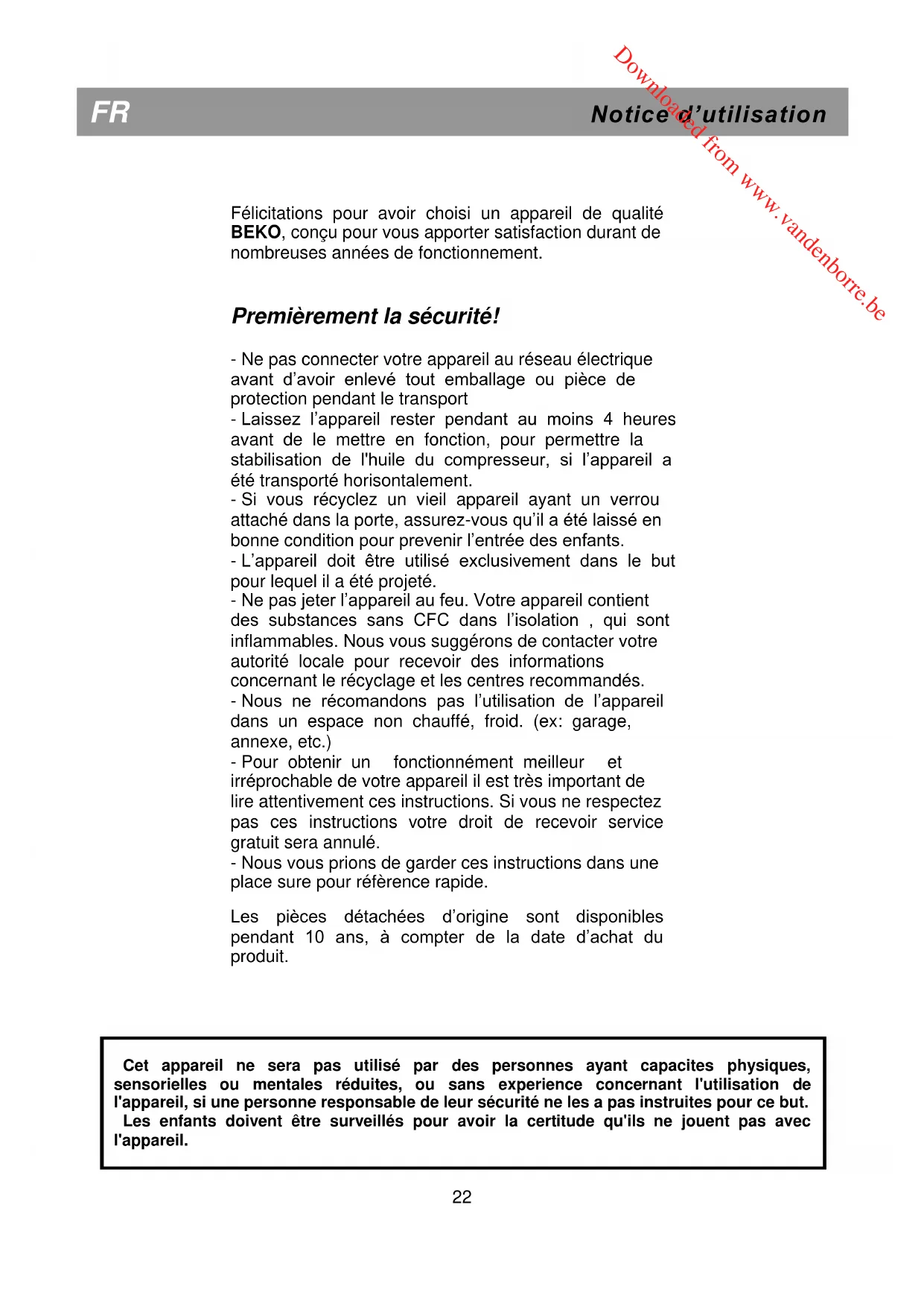 Het symbool op het product of op de verpakking geeft aan dat het product niet als huishoudelijke afval kan worden behandeld. In plaats daarvan moet het worden afgegeven in het toepasselijke recyclagecentrum voor het recycleren van elektrische en elektronische apparaten. Door ervoor te zorgen dat dit product op de juiste manier wordt verwijderd, helpt u potentiële negatieve gevolgen te vermijden voor het milieu en de menselijke gezondheid, die anders veroorzaakt zouden kunnen worden door de verkeerde afvalbehandeling van dit product. Voor meer gedetailleerde informatie over het recycleren van dit product, neem contact op met de plaatselijke instanties, uw huishoudafval- verwerkingsdienst of de winkel waar u het product hebt aangekocht. Downloaded from www.vandenborre.beFélicitations pour avoir choisi un appareil de qualité BEKO, conçu pour vous apporter satisfaction durant de nombreuses années de fonctionnement. Premièrement la sécurité! - Ne pas connecter votre appareil au réseau électrique avant d’avoir enlevé tout emballage ou pièce de protection pendant le transport - Laissez l’appareil rester pendant au moins 4 heures avant de le mettre en fonction, pour permettre la stabilisation de l'huile du compresseur, si l’appareil a été transporté horisontalement. - Si vous récyclez un vieil appareil ayant un verrou attaché dans la porte, assurez-vous qu’il a été laissé en bonne condition pour prevenir l’entrée des enfants. - L’appareil doit être utilisé exclusivement dans le but pour lequel il a été projeté. - Ne pas jeter l’appareil au feu. Votre appareil contient des substances sans CFC dans l’isolation , qui sont inflammables. Nous vous suggérons de contacter votre autorité locale pour recevoir des informations concernant le récyclage et les centres recommandés. - Nous ne récomandons pas l’utilisation de l’appareil dans un espace non chauffé, froid. (ex: garage, annexe, etc.) - Pour obtenir un fonctionnément meilleur et irréprochable de votre appareil il est très important de lire attentivement ces instructions. Si vous ne respectez pas ces instructions votre droit de recevoir service gratuit sera annulé. - Nous vous prions de garder ces instructions dans une place sure pour réfèrence rapide. Les pièces détachées d’origine sont disponibles pendant 10 ans, à compter de la date d’achat du produit.