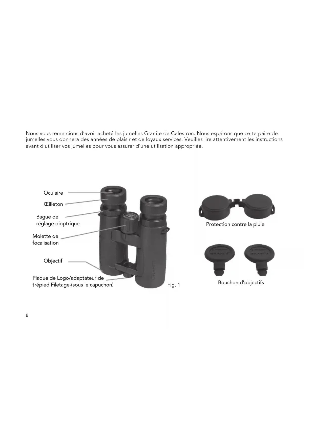 JuMEllEs MoDE D’EMPloi FrAnçAisŒilleton Bague de réglage dioptrique Plaque de Logo/adaptateur de trépied Filetage-(sous le capuchon) Objectif Bouchon d’objectifs Protection contre la pluie Oculaire Molette de focalisation Fig. 1 Nous vous remercions d’avoir acheté les jumelles Granite de Celestron. Nous espérons que cette paire de jumelles vous donnera des années de plaisir et de loyaux services. Veuillez lire attentivement les instructions avant d’utiliser vos jumelles pour vous assurer d’une utilisation appropriée. 8AVERTISSEMENT Ne jamais regarder le soleil pendant l’utilisation de vos jumelles. Regarder vers le soleil peut causer des lésions oculaires permanentes. rÉglAgE dE l’ÉcArt intErpupillAirE L’écart interpupillaire, ou la distance entre les pupilles, varie d’une personne à l’autre. Les jumelles doivent être correctement alignées (ajusté) à la distance entre vos pupilles afin de créer une seule image claire. Pour régler cette distance, soulevez les jumelles jusqu’à vos yeux (en utilisant les deux mains) et regardez à travers eux un objet distant. Déplacez les deux barillets (moitiés) des jumelles le plus près possible ou éloigné jusqu’à ce que vous voyiez une seule image claire (Fig. 2). Vérifiez que l’écart interpupillaire soit défini correctement chaque fois que vous utilisez vos jumelles. rÉglAgE du dioptrE/FocAlisAtion Afin d’assurer une image nette, le système de focalisation de jumelles doit être réglé pour compenser les différences éventuelles de votre vision. Ceci est réalisé en réglant le dioptre (situé sur l’oculaire droit) avant utilisation. Pour régler les jumelles à votre vision, suivez les instructions ci-dessous.
