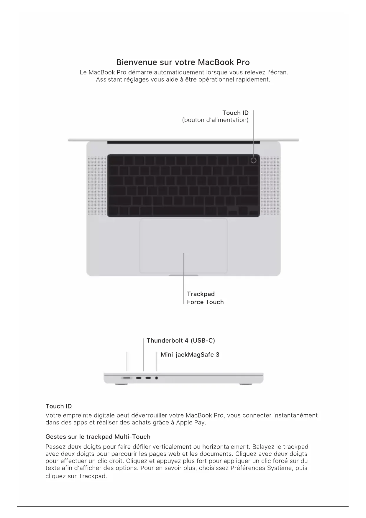 Bienvenue sur votre MacBookPro Le MacBookPro démarre automatiquement lorsque vous relevez l’écran. Assistant réglages vous aide à être opérationnel rapidement. TouchID Votre empreinte digitale peut déverrouiller votre MacBookPro, vous connecter instantanément dans des apps et réaliser des achats grâce à ApplePay. Gestes sur le trackpad Multi-Touch Passez deux doigts pour faire défiler verticalement ou horizontalement. Balayez le trackpad avec deux doigts pour parcourir les pages web et les documents. Cliquez avec deux doigts pour effectuer un clic droit. Cliquez et appuyez plus fort pour appliquer un clic forcé sur du texte afin d’afficher des options. Pour en savoir plus, choisissez Préférences Système, puis cliquez sur Trackpad. TouchID (bouton d’alimentation) Trackpad ForceTouch Thunderbolt4 (USB-C) Mini-jackMagSafe3Barre des menus Caméra HD FaceTime Centre de contrôle Dock Préférences SystèmeFinder Thunderbolt4 (USB-C) HDMI Logement de carteSDXCLa disponibilité des fonctionnalités dépend de la zone géographique. ©2021AppleInc. Tous droits réservés. Designed by Apple in California. Printed in XXXX. F034-04774-A Pour en savoir plus sur la configuration et l’utilisation de votre MacBookPro, consultez le guide Les indispensables du MacBookPro à l’adresse support.apple.com/guide/macbook-pro. Pour des informations détaillées, consultez support.apple.com/fr-fr/mac/macbook-pro. Pourcontacter Apple, reportez-vous à la page support.apple.com/fr-fr/contact.