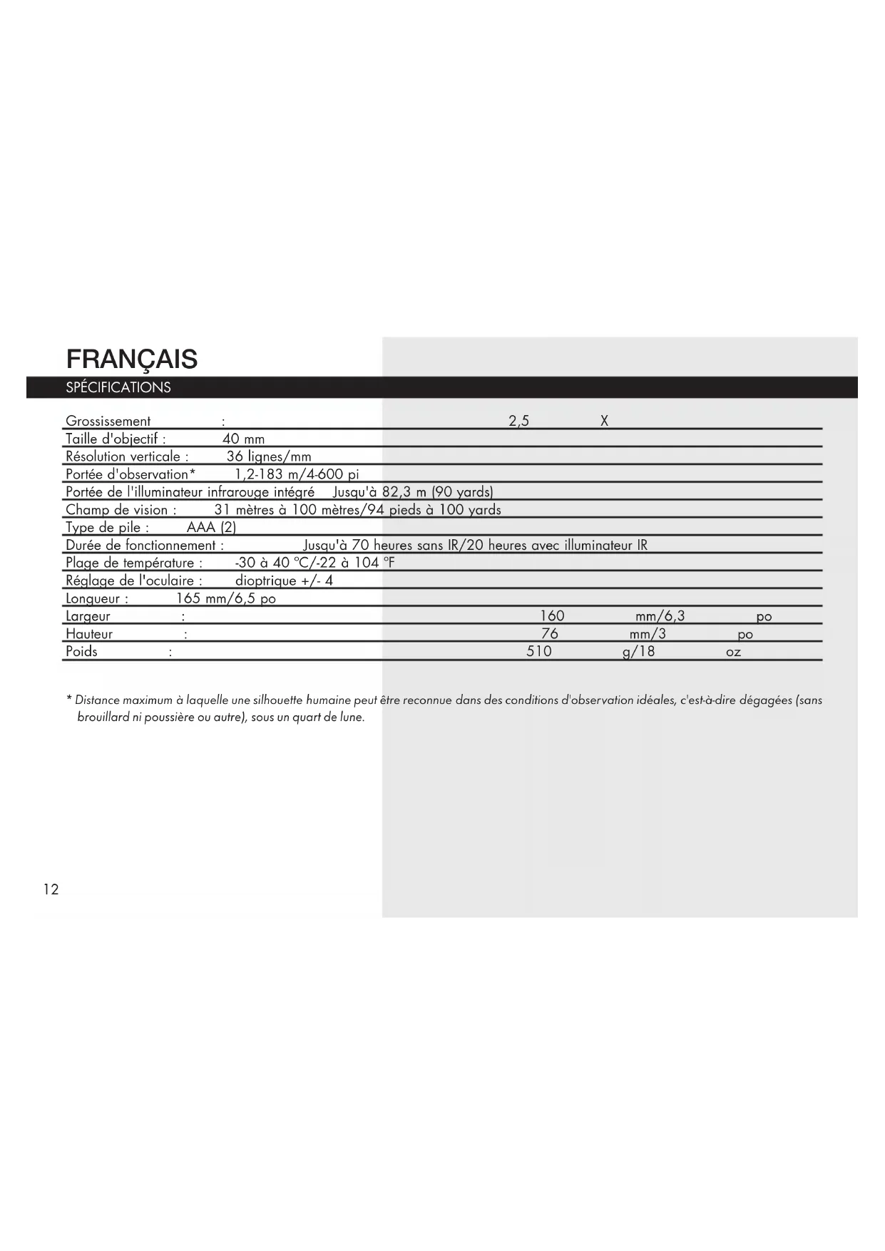 soit endommagé durant le transport ; envoyez-le en port payé, à l’adresse indiquée ci-dessous : IAux États-Unis, envoyez à Au CANADA, envoyez à: Bushnell Outdoor Products Bushnell Outdoor Products Attn.: Repairs Attn.: Repairs 9200 Cody 140 Great Gulf Drive, Unit # B Overland Park, Kansas 66214 Vaughan, Ontario L4K 5W5 Pour les produits achetés en dehors des États-Unis et du Canada, veuillez contacter votre distributeur local pour tous renseignements concernant la garantie. En Europe, vous pouvez aussi contacter Bushnell au: Bushnell Germany GmbH European Service Centre Mathias-Brüggen-Str. 80 D-50827 Köln GERMANY Tél: +49 221 995568-0 Fax: +49 221 995568-20 La présente garantie vous donne des droits légaux spécifiques. Vous pouvez avoir d’autres droits qui varient selon les pays. ©2014 Bushnell Outdoor Products GARANTIE LIMITÉE de UN ANNÉE19 Traitement des déchets d’équipements électriques et électroniques (En vigueur dans l’Union européenne et autres pays européens ayant des systèmes de collecte des déchets séparés) Cet équipement contient des composants électriques et/ou électroniques et par conséquent ne doit pas être éliminé en fin de vie avec les autres déchets ménagers. Vous devez au contraire vous débarasser de ce produit afin qu’il soit recyclé aux points de collecte respectifs fournis par les communautés locales. Pour vous, ceci est sans frais. Si l’équipement contient des piles amovibles (rechargeables), celles-ci doivent également être retirées de l’équipement et, si nécessaire, être éliminées à leur tour conformément aux règlements en vigueur (voir également les commentaires respectifs dans la notice d’utilisation de ce produit). De plus amples renseignements à ce sujet sont disponibles auprès de votre mairie, votre compagnie de ramassage d’ordures locale, ou dans le magasin où vous avez acheté cet équipement.20 ESpañoL ESPECIFICACIONES Aumento: 2,5 X Tamaño del objetivo: 40 mm Resolución vertical: 36 líneas/mm Alcance de visión* 4-600 pies/1,2-183 m Alcance del iluminador por infrarrojos integrado Hasta 90 yardas (82,3 m) Campo de visión: De 94 pies a 100 yardas/de 31 metros a 100 metros Tipo de pila: AAA (2) Tiempo de funcionamiento: Hasta 70 horas sin IR/20 horas con iluminador IR Rango de temperatura De -22 a 104 º F/de -30 a 40 º C Ajuste del ocular: +/- 4 dioptría Longitud: 6,5 in/165 mm Anchura 6,3 pulgadas/160 mm Altura: 3,0 pulgadas/76 mm Peso: 18,0 oz/510 g