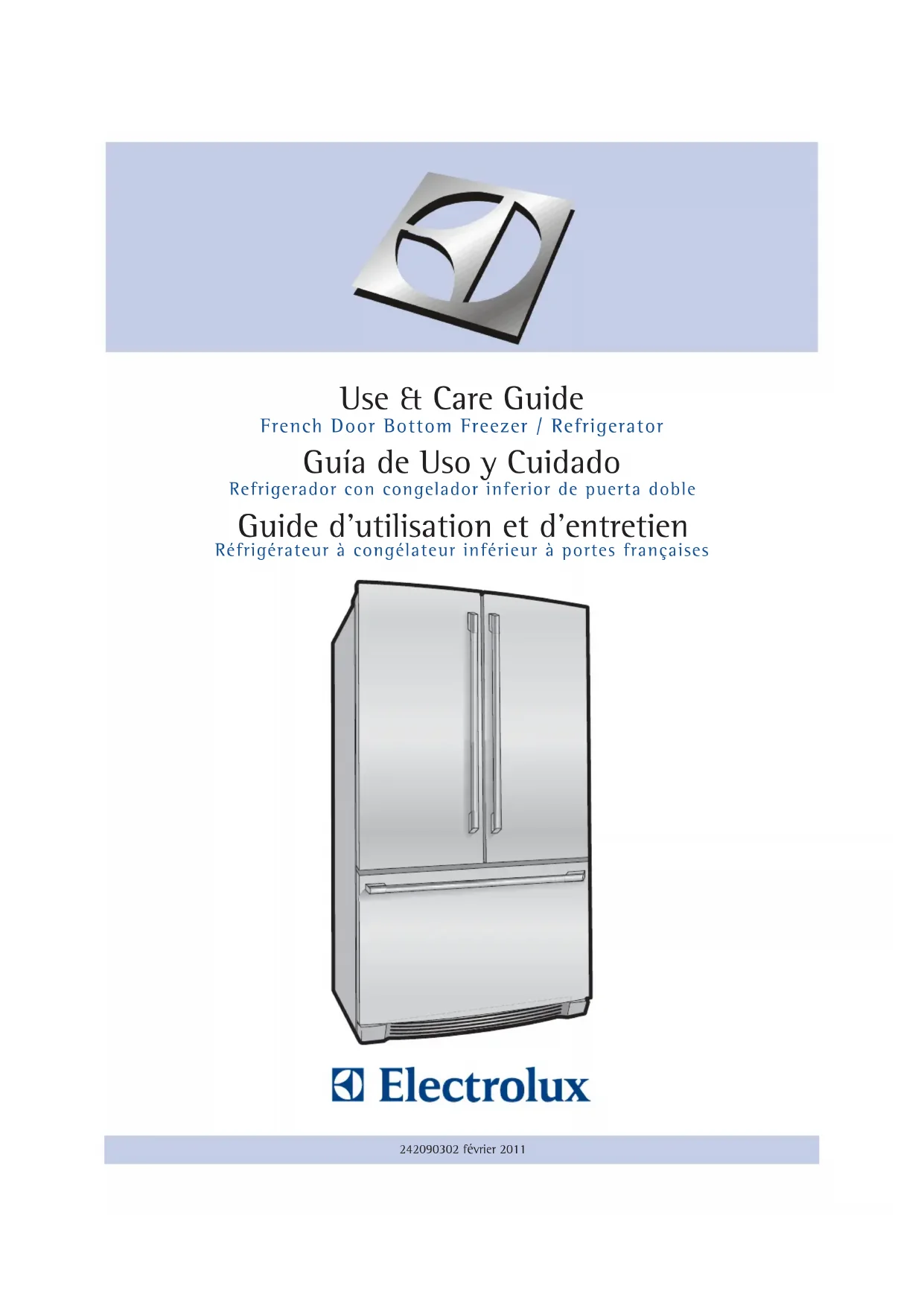 - 242090302 février 2011 Use & Care Guide French Door Bottom Freezer / Refrigerator Guía de Uso y Cuidado Refrigerador con congelador inferior de puerta doble Guide d’utilisation et d’entretien Réfrigérateur à congélateur inférieur à portes françaises2 Trouver l’information Veuillez lire et conserver ce guide Nous vous remercions d’avoir choisi Electrolux, la nouvelle marque de première qualité pour les appareils électroménagers. Ce Guide d’utilisation et d’entretien fait partie de notre engagement à satisfaire le client et à lui fournir un produit de qualité pendant toute la durée de vie de son nouveau réfrigérateur.Date d’achatNuméro de modèle ElectroluxNuméro de série Electrolux Gardez un enregistrement pour référence rapide Trouver l’information p. 2