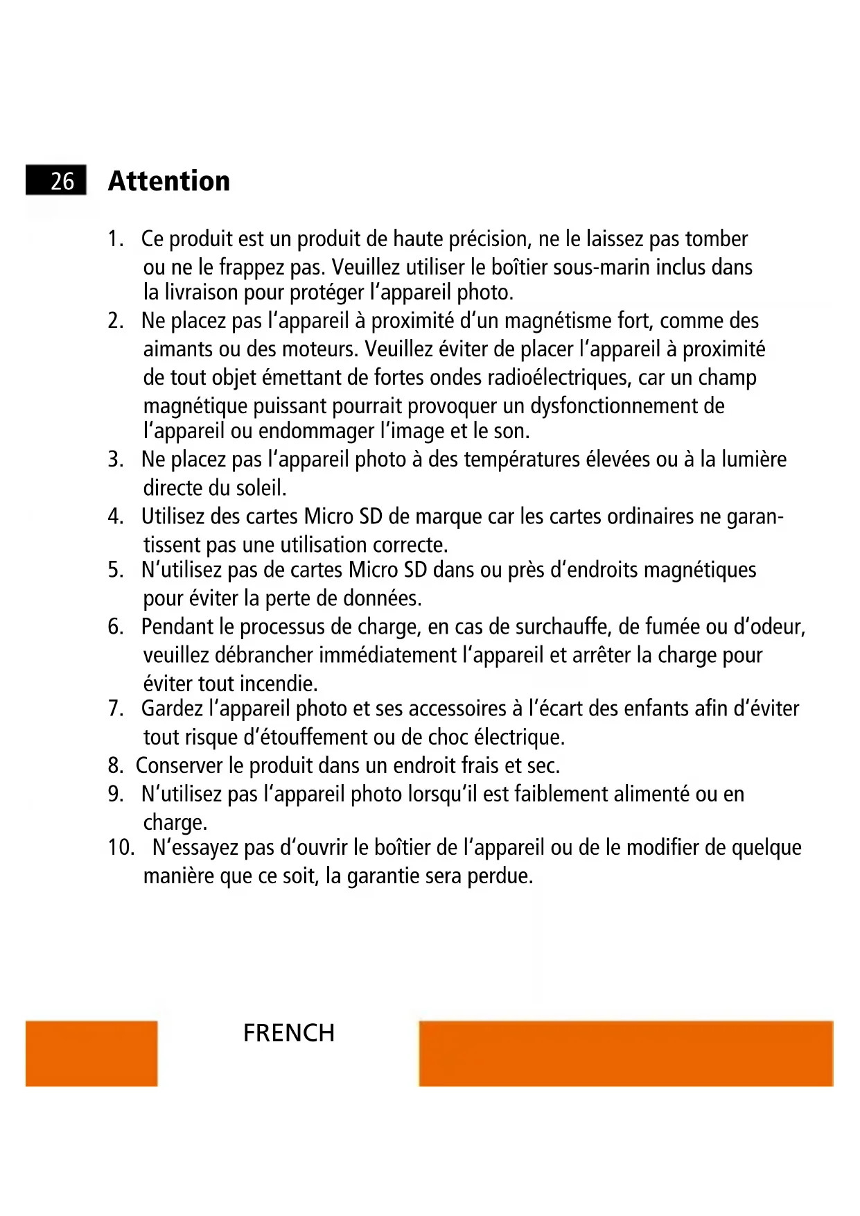 ou ne le frappez pas. Veuillez utiliser le boîtier sous-marin inclus dans la livraison pour protéger l‘appareil photo.