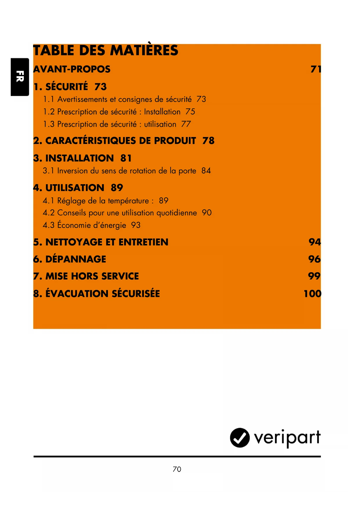VPKVC176W - Réfrigérateur Veripart - Notice d'utilisation et mode d'emploi gratuit