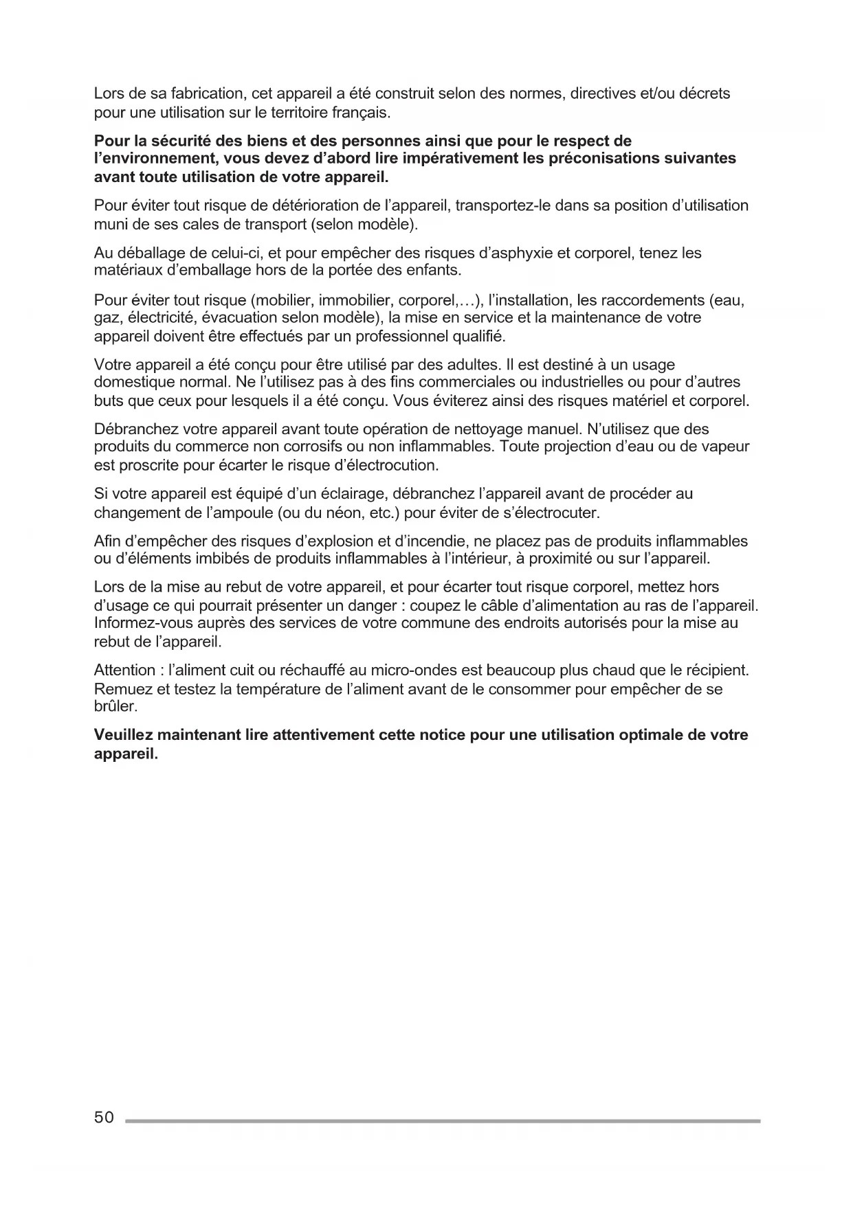 Drehteller ø 272 mm, glass gewicht ca. 16 kg techniSche DAten UMWeLtinFOrMAtiOn 2_Zanker_German_CS_BASE Z16UICTO_Layout 1 15/06/2020 10:12 Page 4950 Lors de sa fabrication, cet appareil a été construit selon des normes, directives et/ou décrets pour une utilisation sur le territoire français. Pour la sécurité des biens et des personnes ainsi que pour le respect de l’environnement, vous devez d’abord lire impérativement les préconisations suivantes avant toute utilisation de votre appareil. Pour éviter tout risque de détérioration de l’appareil, transportez-le dans sa position d’utilisation muni de ses cales de transport (selon modèle). Au déballage de celui-ci, et pour empêcher des risques d’asphyxie et corporel, tenez les matériaux d’emballage hors de la portée des enfants. Pour éviter tout risque (mobilier, immobilier, corporel,…), l’installation, les raccordements (eau, gaz, électricité, évacuation selon modèle), la mise en service et la maintenance de votre appareil doivent être effectués par un professionnel qualifié. Votre appareil a été conçu pour être utilisé par des adultes. Il est destiné à un usage domestique normal. Ne l’utilisez pas à des fins commerciales ou industrielles ou pour d’autres buts que ceux pour lesquels il a été conçu. Vous éviterez ainsi des risques matériel et corporel. Débranchez votre appareil avant toute opération de nettoyage manuel. N’utilisez que des produits du commerce non corrosifs ou non inflammables. Toute projection d’eau ou de vapeur est proscrite pour écarter le risque d’électrocution. Si votre appareil est équipé d’un éclairage, débranchez l’appareil avant de procéder au changement de l’ampoule (ou du néon, etc.) pour éviter de s’électrocuter. Afin d’empêcher des risques d’explosion et d’incendie, ne placez pas de produits inflammables ou d’éléments imbibés de produits inflammables à l’intérieur, à proximité ou sur l’appareil. Lors de la mise au rebut de votre appareil, et pour écarter tout risque corporel, mettez hors d’usage ce qui pourrait présenter un danger: coupez le câble d’alimentation au ras de l’appareil. Informez-vous auprès des services de votre commune des endroits autorisés pour la mise au rebut de l’appareil. Attention: l’aliment cuit ou réchauffé au micro-ondes est beaucoup plus chaud que le récipient. Remuez et testez la température de l’aliment avant de le consommer pour empêcher de se brûler. Veuillez maintenant lire attentivement cette notice pour une utilisation optimale de votre appareil. 3_Zanker_French_CS_BASE_Z16UICTO_Layout 1 15/06/2020 10:17 Page 5051 SOMMAIRE Avertissements importants de sécurité 51 Installation 56 Vue d’ensemble de l’appareil 61 Avant la mise en service 62 Fonctionnement 63 Illustrations de cuisson 67 Astuces et conseils 74 En cas d'anomalie de fonctionnement 76 Caractéristiques techniques 77 Informations environnementales 77 Sous réserve de modifications. AVERTISSEMENTS IMPORTANTS DE SéCURITé Cet appareil peut être utilisé par des enfants d’au moins 8 ans et par des personnes dont les capacités physiques, sensorielles ou mentales sont réduites ou qui manquent d’expérience ou de connaissances, à condition qu’ils soient supervisés ou qu’ils aient reçu des instructions préalables concernant l’utilisation en toute sécurité de l’appareil et qu’ils en comprennent les dangers. Les enfants ne doivent se servir du four que sous la surveillance d’un adulte. Les enfants ne doivent pas nettoyer l’appareil ni effectuer d’opérations d’entretien utilisateur, à moins qu’ils aient au moins 8 ans et qu’ils le fassent sous surveillance. Cet appareil n’est pas destiné à être utilisé à des altitudes de plus de 2 000 m