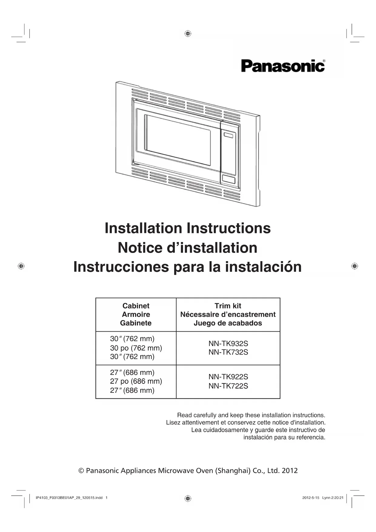 micro-ondes Panasonic identifiés dans le tableau ci-dessous, aux fins d’une installation dans une armoire.
