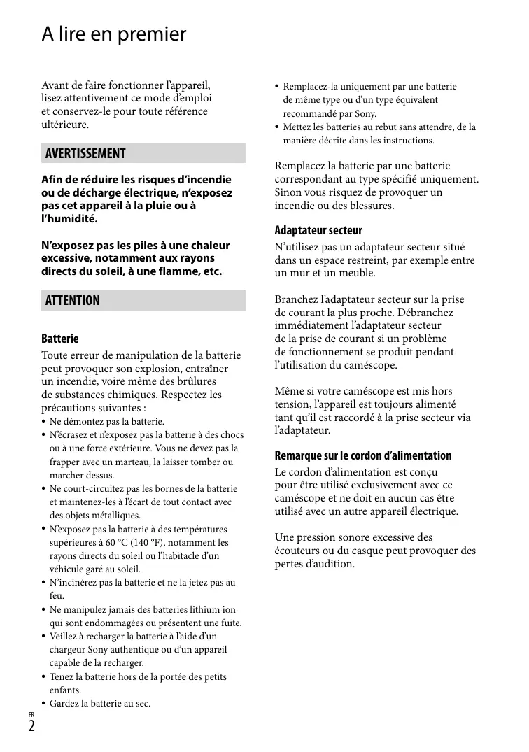 Remplacez-la uniquement par une batterie de même type ou d’un type équivalent recommandé par Sony. Mettez les batteries au rebut sans attendre, de la manière décrite dans les instructions. Remplacez la batterie par une batterie correspondant au type spécifié uniquement. Sinon vous risquez de provoquer un incendie ou des blessures. Adaptateur secteur N’utilisez pas un adaptateur secteur situé dans un espace restreint, par exemple entre un mur et un meuble. Branchez l’adaptateur secteur sur la prise de courant la plus proche. Débranchez immédiatement l’adaptateur secteur de la prise de courant si un problème de fonctionnement se produit pendant l’utilisation du caméscope. Même si votre caméscope est mis hors tension, l’appareil est toujours alimenté tant qu’il est raccordé à la prise secteur via l’adaptateur. Remarque sur le cordon d’alimentation Le cordon d’alimentation est conçu pour être utilisé exclusivement avec ce caméscope et ne doit en aucun cas être utilisé avec un autre appareil électrique. Une pression sonore excessive des écouteurs ou du casque peut provoquer des pertes d’audition.