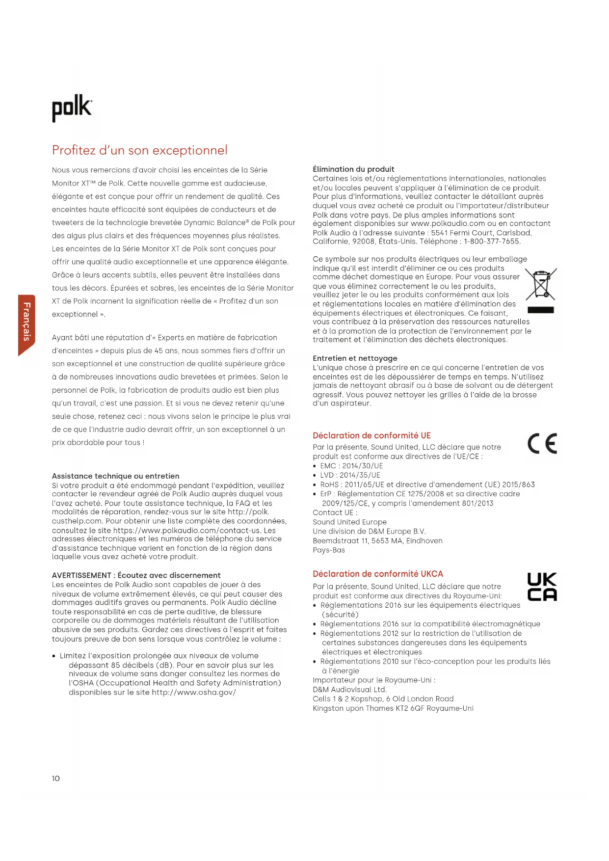 - Limitez l’exposition prolongée aux niveaux de volume dépassant 85 décibels (dB). Pour en savoir plus sur les niveaux de volume sans danger consultez les normes de l’OSHA (Occupational Health and Safety Administration) disponibles sur le site http://www.osha.gov/ Élimination du produit Certaines lois et/ou réglementations internationales, nationales et/ou locales peuvent s’appliquer à l’élimination de ce produit. Pour plus d’informations, veuillez contacter le détaillant auprès duquel vous avez acheté ce produit ou l’importateur/distributeur Polk dans votre pays. De plus amples informations sont également disponibles sur www.polkaudio.com ou en contactant Polk Audio à l’adresse suivante : 5541 Fermi Court, Carlsbad, Californie, 92008, États-Unis. Téléphone : 1-800-377-7655. Ce symbole sur nos produits électriques ou leur emballage indique qu’il est interdit d’éliminer ce ou ces produits comme déchet domestique en Europe. Pour vous assurer que vous éliminez correctement le ou les produits, veuillez jeter le ou les produits conformément aux lois et réglementations locales en matière d’élimination des équipements électriques et électroniques. Ce faisant, vous contribuez à la préservation des ressources naturelles et à la promotion de la protection de l’environnement par le traitement et l’élimination des déchets électroniques. Entretien et nettoyage L’unique chose à prescrire en ce qui concerne l’entretien de vos enceintes est de les dépoussiérer de temps en temps. N’utilisez jamais de nettoyant abrasif ou à base de solvant ou de détergent agressif. Vous pouvez nettoyer les grilles à l’aide de la brosse d’un aspirateur. Déclaration de conformité UE Par la présente, Sound United, LLC déclare que notre produit est conforme aux directives de l’UE/CE :