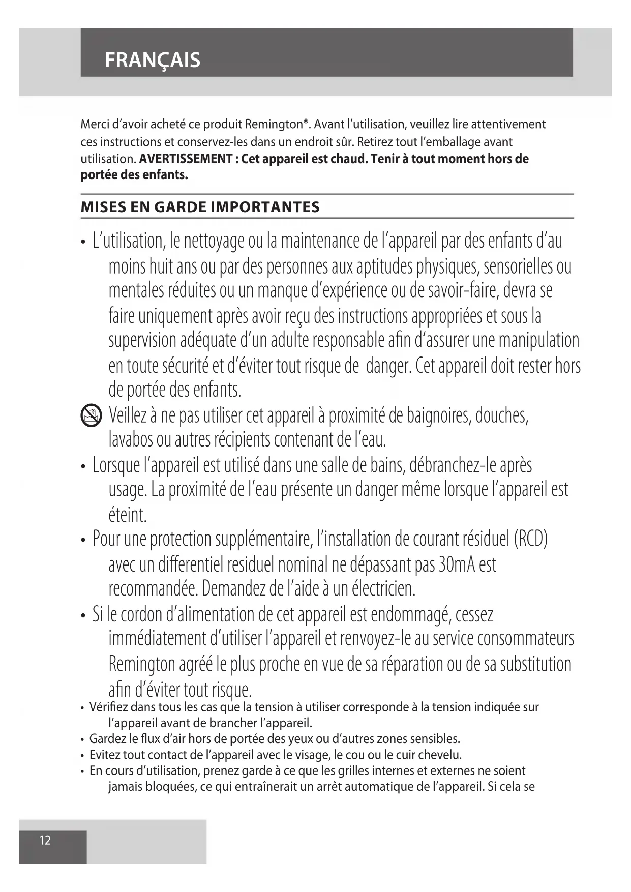 AE12 FRANÇAIS Merci d’avoir acheté ce produit Remington®. Avant l’utilisation, veuillez lire attentivement ces instructions et conservez-les dans un endroit sûr. Retirez tout l’emballage avant utilisation. AVERTISSEMENT : Cet appareil est chaud. Tenir à tout moment hors de portée des enfants.