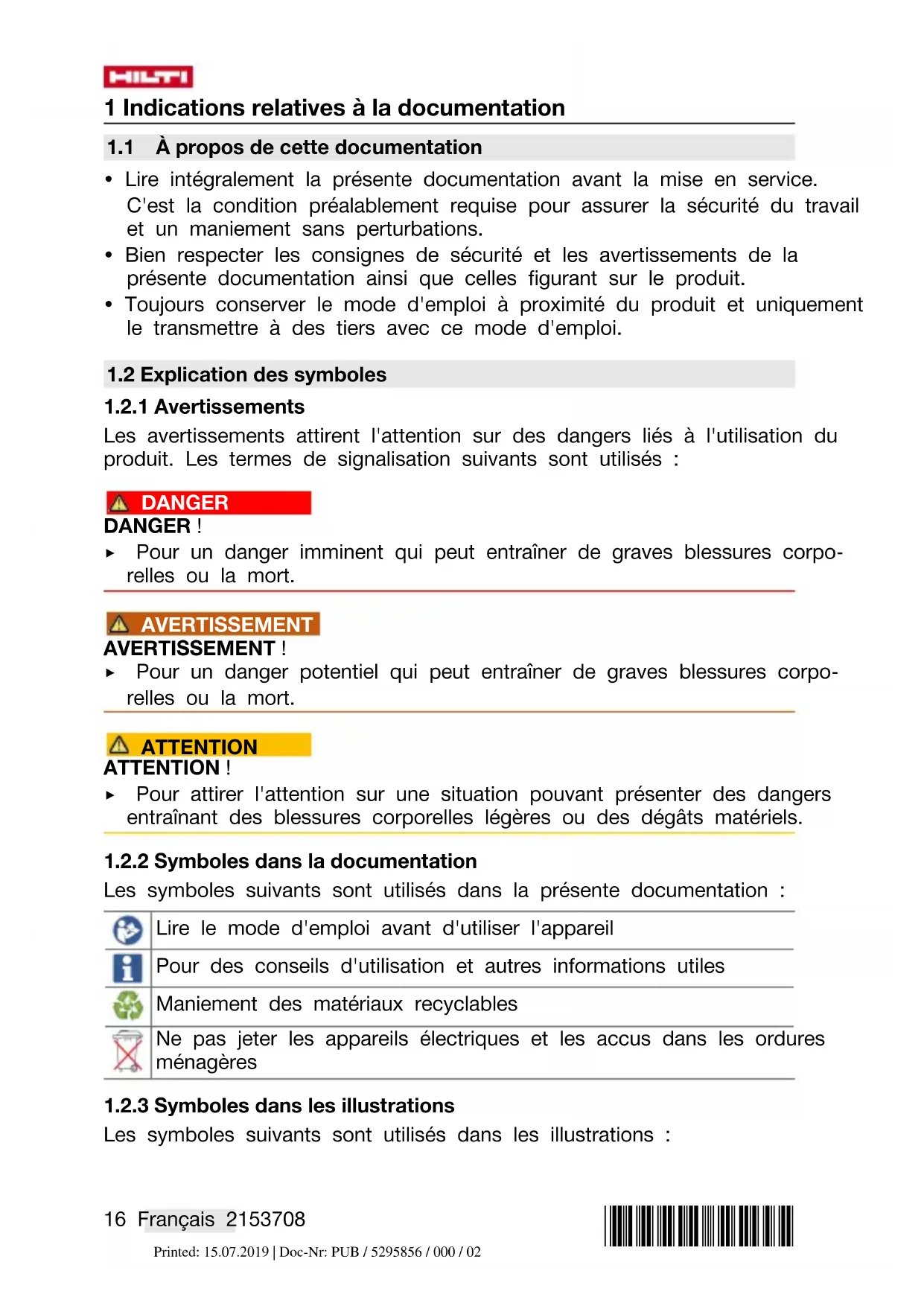 Nous déclarons sous notre seule et unique responsabilité que le produit décrit ici est conforme aux directives et normes en vigueur. Une copie de l'attestation délivrée par l'organisme de certification se trouve en fin de la présente documentation. Pour obtenir les documentations techniques, s'adresser à : Hilti Entwicklungsgesellschaft mbH | Zulassung Geräte | Hiltistraße 6 | 86916 Kaufering, DE 2 Sécurité