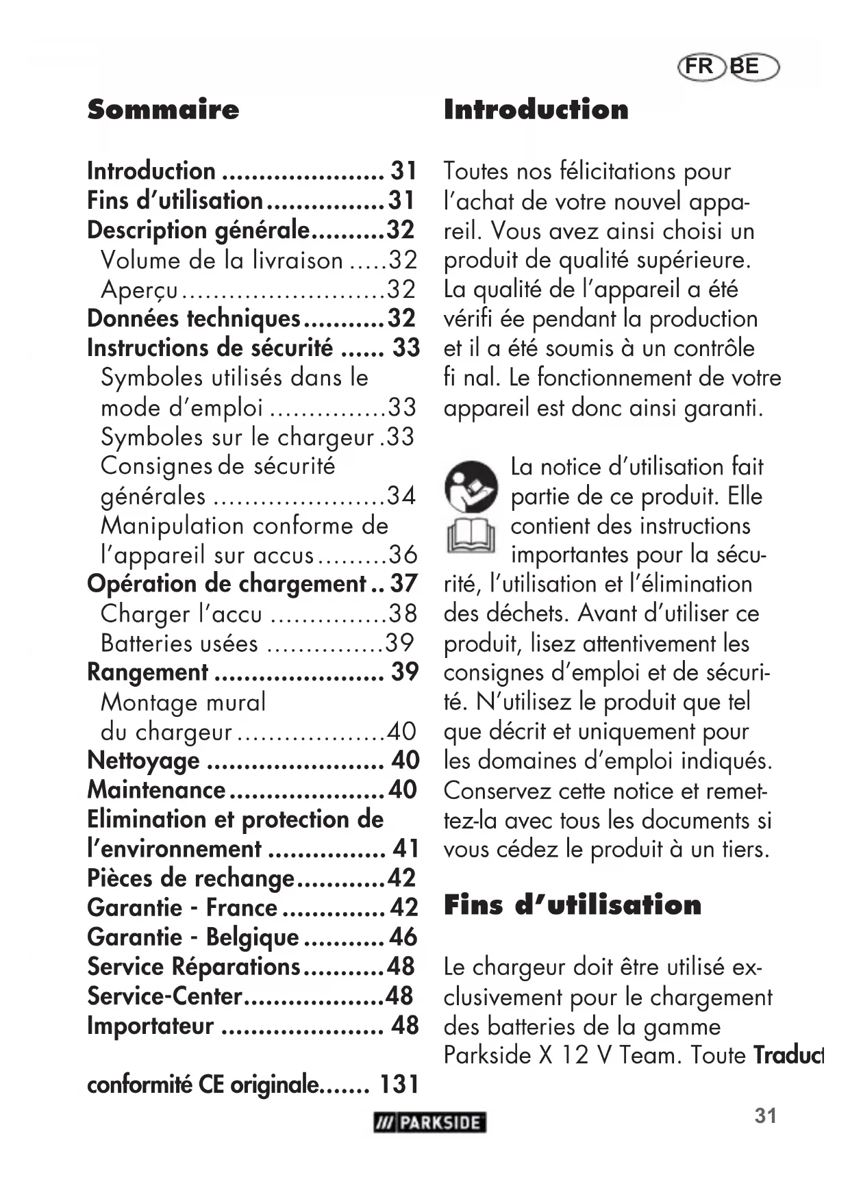 - Stockstädter Straße 20 63762 Großostheim GERMANY www.grizzlytools-service.eu31 FR BE Introduction Toutes nos félicitations pour l’achat de votre nouvel appa- reil. Vous avez ainsi choisi un produit de qualité supérieure. La qualité de l’appareil a été vérifi ée pendant la production et il a été soumis à un contrôle fi nal. Le fonctionnement de votre appareil est donc ainsi garanti. La notice d’utilisation fait partie de ce produit. Elle contient des instructions importantes pour la sécu- rité, l’utilisation et l’élimination des déchets. Avant d’utiliser ce produit, lisez attentivement les consignes d’emploi et de sécuri- té. N’utilisez le produit que tel que décrit et uniquement pour les domaines d’emploi indiqués. Conservez cette notice et remet- tez-la avec tous les documents si vous cédez le produit à un tiers. Fins d’utilisation Le chargeur doit être utilisé ex- clusivement pour le chargement des batteries de la gamme Parkside X12VTeam. Toute Traduction de la déclaration de conformité CE originale p. 131