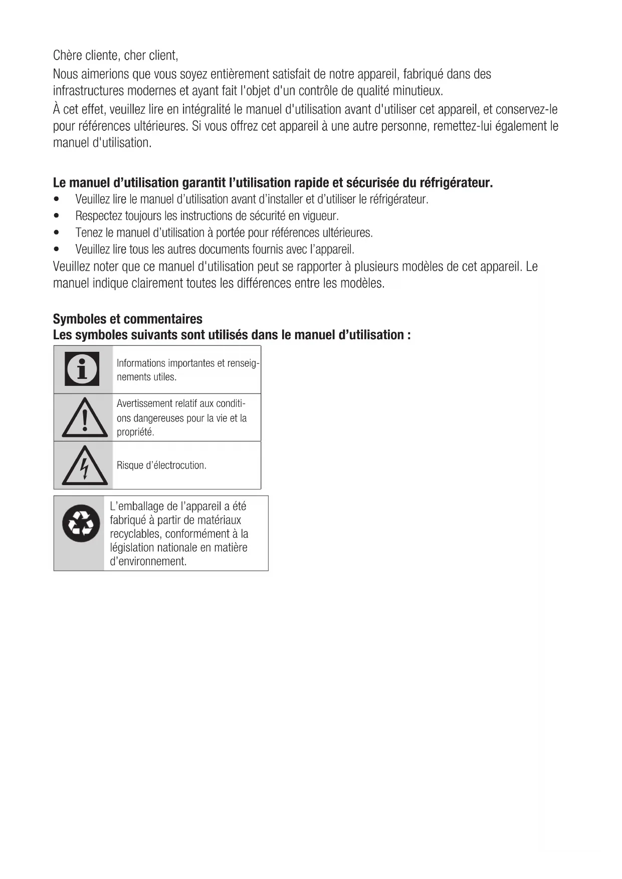RECOMENDAÇÕES: Se os problemas persistirem depois de seguir as instruções nesta secção, contactar o seu vendedor ou uma Assistência Autorizada. Não tentar reparar o produto.Chère cliente, cher client, Nous aimerions que vous soyez entièrement satisfait de notre appareil, fabriqué dans des infrastructures modernes et ayant fait l'objet d'un contrôle de qualité minutieux. À cet effet, veuillez lire en intégralité le manuel d'utilisation avant d'utiliser cet appareil, et conservez-le pour références ultérieures. Si vous offrez cet appareil à une autre personne, remettez-lui également le manuel d'utilisation. Le manuel d’utilisation garantit l’utilisation rapide et sécurisée du réfrigérateur. t Veuillez lire le manuel d’utilisation avant d’installer et d’utiliser le réfrigérateur. t Respectez toujours les instructions de sécurité en vigueur. t Tenez le manuel d’utilisation à portée pour références ultérieures. t Veuillez lire tous les autres documents fournis avec l’appareil. Veuillez noter que ce manuel d'utilisation peut se rapporter à plusieurs modèles de cet appareil. Le manuel indique clairement toutes les différences entre les modèles. Symboles et commentaires Les symboles suivants sont utilisés dans le manuel d’utilisation :