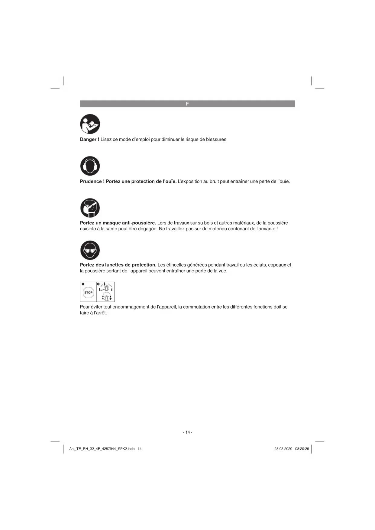 Danger ! Lisez ce mode d’emploi pour diminuer le risque de blessures Prudence ! Portez une protection de l’ouïe. L’exposition au bruit peut entraîner une perte de l’ouïe. Portez des lunettes de protection. Les étincelles générées pendant travail ou les éclats, copeaux et la poussière sortant de l’appareil peuvent entraîner une perte de la vue. Portez un masque anti-poussière. Lors de travaux sur su bois et autres matériaux, de la poussière nuisible à la santé peut être dégagée. Ne travaillez pas sur du matériau contenant de l’amiante ! Pour éviter tout endommagement de l’appareil, la commutation entre les diff érentes fonctions doit se faire à l’arrêt. Anl_TE_RH_32_4F_4257944_SPK2.indb 14Anl_TE_RH_32_4F_4257944_SPK2.indb 14 25.03.2020 08:20:2925.03.2020 08:20:29F