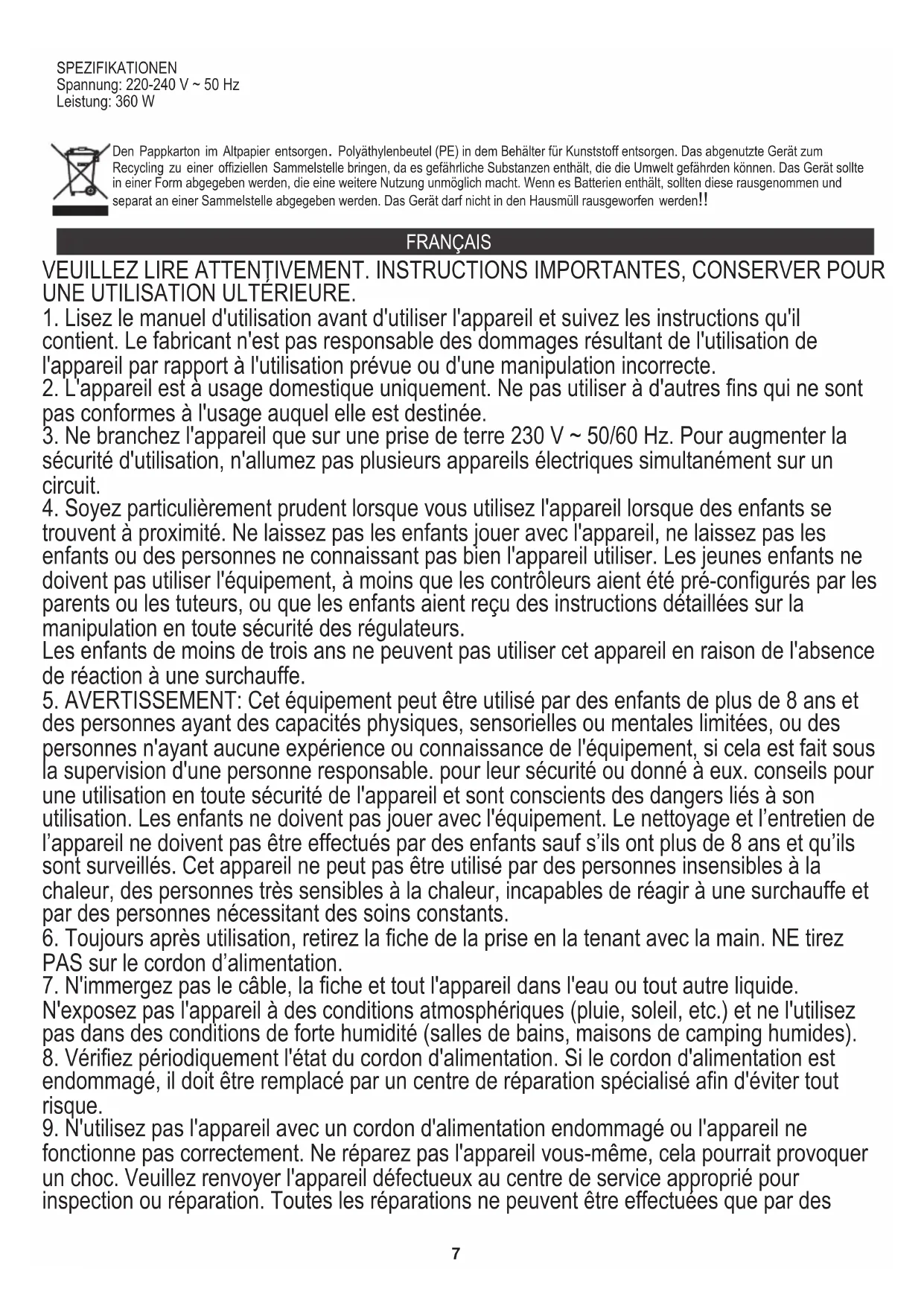 Puissance: 360 W Tension: 220-240V ~ 50Hz CARACTÉRISTIQUES Pour nettoyer le couvercle (4), lavez-le à la main à 30 ° C maximum. Ne pas utiliser d'eau de Javel.