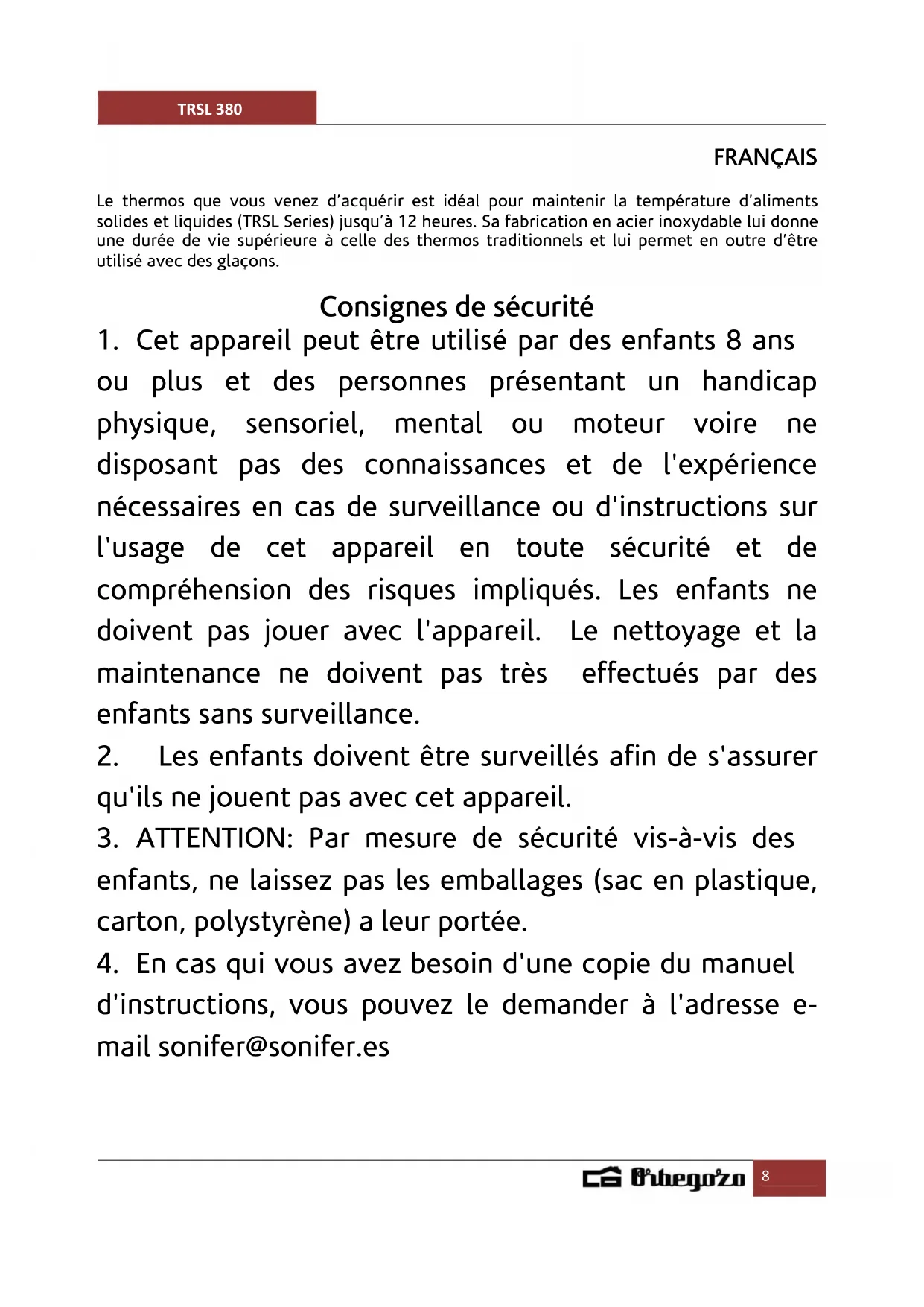 TRSL 380 - Bouteille isotherme Orbegozo - Notice d'utilisation et mode d'emploi gratuit