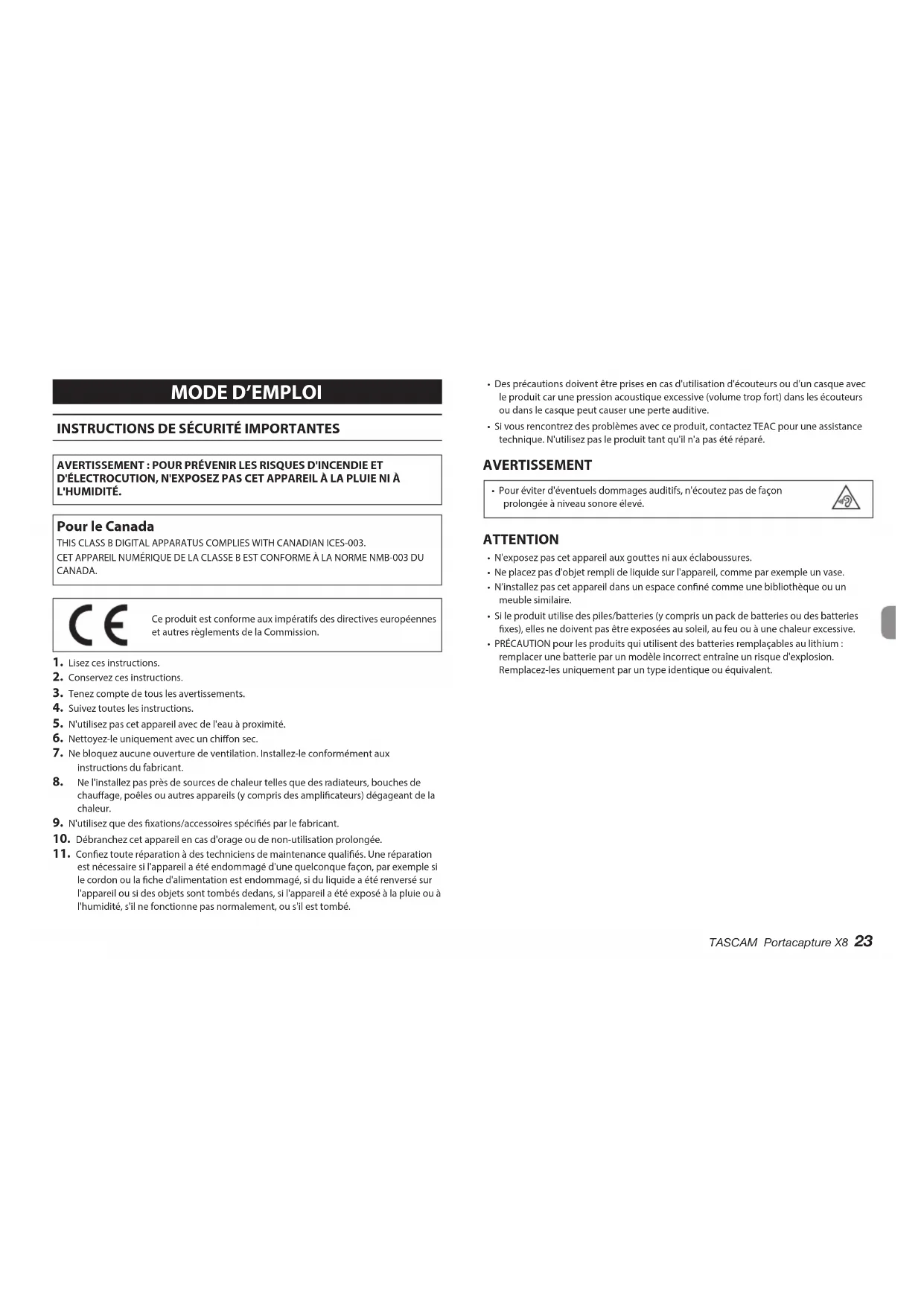 D'ÉLECTROCUTION, N'EXPOSEZ PAS CET APPAREIL À LA PLUIE NI À L'HUMIDITÉ. Pour le Canada THIS CLASS B DIGITAL APPARATUS COMPLIES WITH CANADIAN ICES-003.CET APPAREIL NUMÉRIQUE DE LA CLASSE B EST CONFORME À LA NORME NMB-003 DU CANADA. Ce produit est conforme aux impératifs des directives européennes et autres règlements de la Commission.