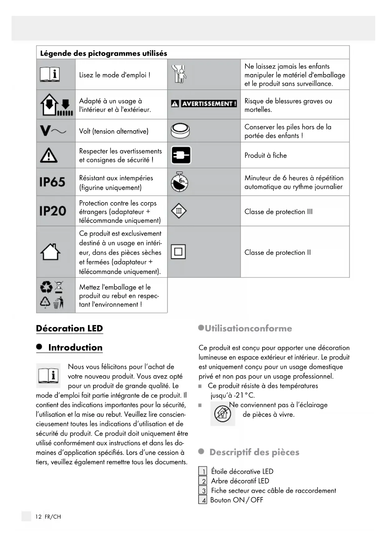 Mettez l'emballage et le produit au rebut en respec- tant l'environnement! Décoration LED Introduction Nous vous félicitons pour l‘achat de votre nouveau produit. Vous avez opté pour un produit de grande qualité. Le mode d‘emploi fait partie intégrante de ce produit. Il contient des indications importantes pour la sécurité, l’utilisation et la mise au rebut. Veuillez lire conscien- cieusement toutes les indications d‘utilisation et de sécurité du produit. Ce produit doit uniquement être utilisé conformément aux instructions et dans les do- maines d‘application spécifiés. Lors d‘une cession à tiers, veuillez également remettre tous les documents. Utilisation conforme Ce produit est conçu pour apporter une décoration lumineuse en espace extérieur et intérieur. Le produit est uniquement conçu pour un usage domestique privé et non pas pour un usage professionnel. Ce produit résiste à des températures jusqu‘à -21°C. Ne conviennent pas à l’éclairage de pièces à vivre. Descriptif des pièces