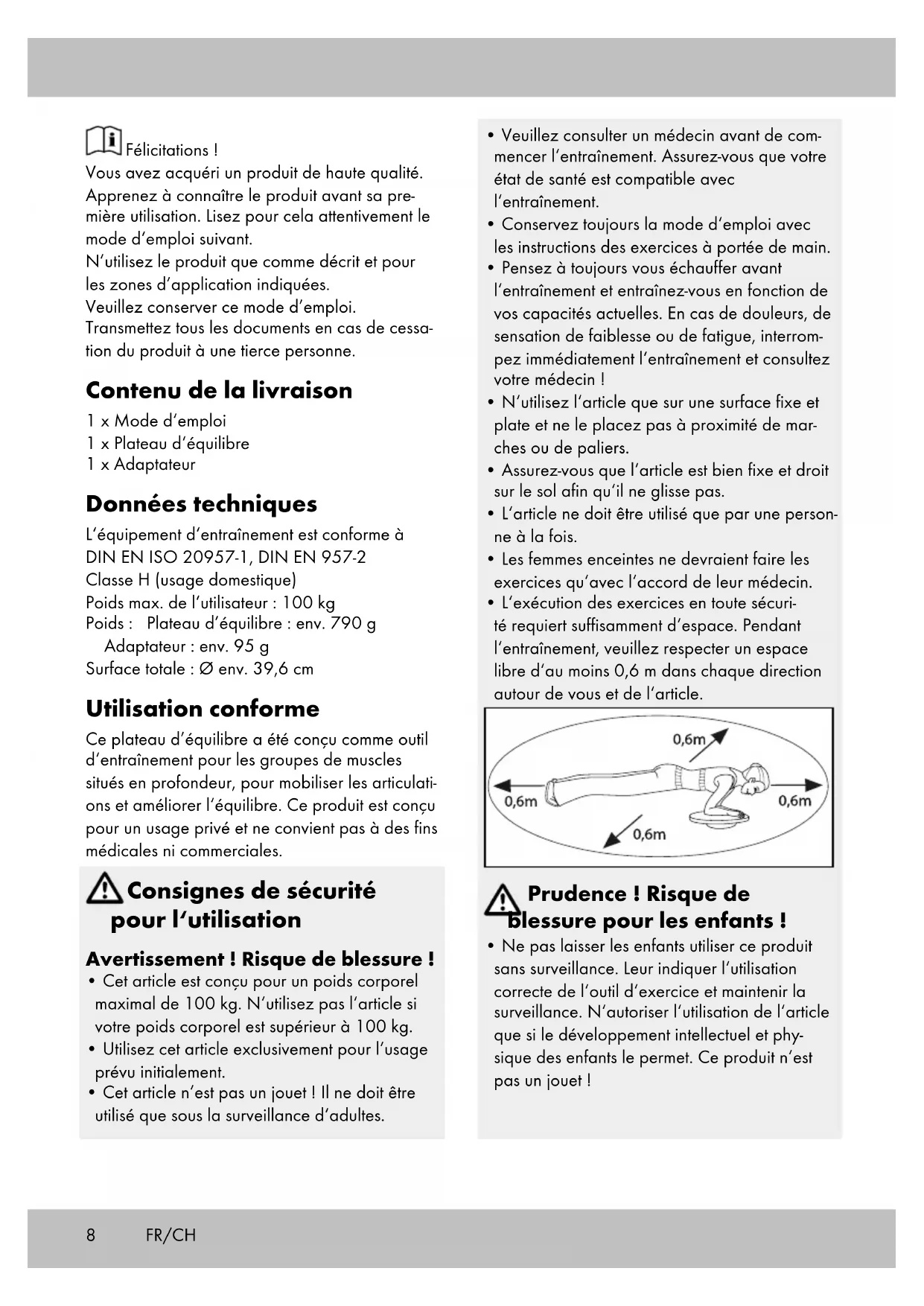 - L‘exécution des exercices en toute sécuri- té requiert suffisamment d‘espace. Pendant l‘entraînement, veuillez respecter un espace libre d‘au moins 0,6 m dans chaque direction autour de vous et de l‘article. Prudence ! Risque de blessure pour les enfants !