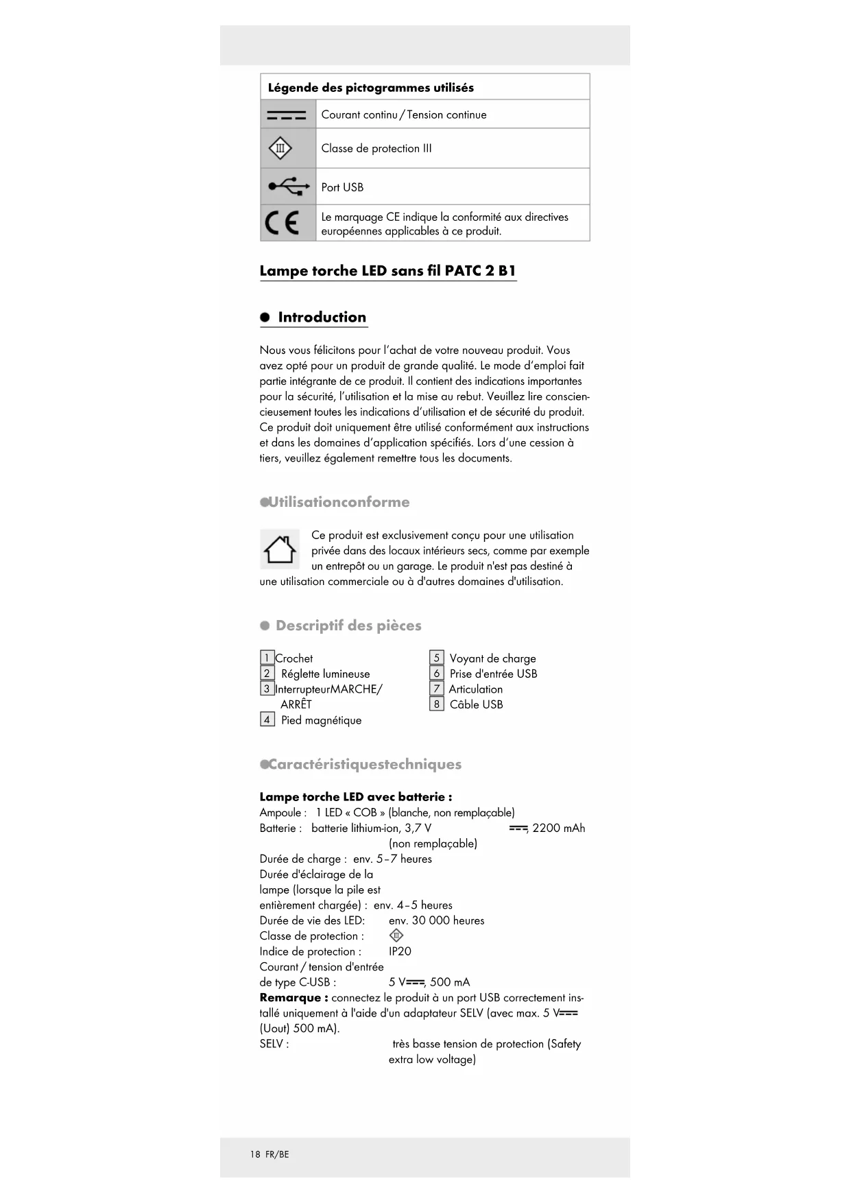 available as proof of purchase. You will find the item number on the rating plate, an engraving on the front page of the instructions for use (bottom left), or as a sticker on the rear or bottom of the product. If functional or other defects occur, please contact the service depart- ment listed either by telephone or by e-mail. You can return a defective product to us free of charge to the service address that will be provided to you. Ensure that you enclose the proof of purchase (till receipt) and information about what the defect is and when it occurred. Service Service Great Britain Tel.: 08000569216 E-Mail: owim@lidl.co.uk Service Ireland Tel.: 1800 200736 E-Mail: owim@lidl.ie17 FR/BE Légende des pictogrammes utilisés ........... Page 18 Introduction .................................................................... Page 18 Utilisation conforme ............................................................. Page 18 Descriptif des pièces ............................................................ Page 18 Caractéristiques techniques ................................................. Page 18 Contenu de la livraison ........................................................ Page 19 Consignes de sécurité ............................................ Page 19 Consignes de sécurité relatives aux piles / aux piles rechargeables ...................................................................... Page 19 Avant l'utilisation ....................................................... Page 20 Charger le produit ............................................................... Page 20 Utilisation ......................................................................... Page 20 Utiliser le produit sans branchement électrique ................. Page 21 Dépannage ..................................................................... Page 21 Entretien et nettoyage........................................... Page 21 Mise au rebut ................................................................ Page 21 Garantie ............................................................................ Page 22 Faire valoir sa garantie ........................................................ Page 23 Service après-vente .............................................................. Page 2418 FR/BE Légende des pictogrammes utilisés Courant continu / Tension continue Classe de protection III Port USB Le marquage CE indique la conformité aux directives européennes applicables à ce produit. Lampe torche LED sans fil PATC 2 B1 Introduction Nous vous félicitons pour l‘achat de votre nouveau produit. Vous avez opté pour un produit de grande qualité. Le mode d‘emploi fait partie intégrante de ce produit. Il contient des indications importantes pour la sécurité, l’utilisation et la mise au rebut. Veuillez lire conscien- cieusement toutes les indications d‘utilisation et de sécurité du produit. Ce produit doit uniquement être utilisé conformément aux instructions et dans les domaines d‘application spécifiés. Lors d‘une cession à tiers, veuillez également remettre tous les documents. Utilisation conforme Ce produit est exclusivement conçu pour une utilisation privée dans des locaux intérieurs secs, comme par exemple un entrepôt ou un garage. Le produit n'est pas destiné à une utilisation commerciale ou à d'autres domaines d'utilisation. Descriptif des pièces