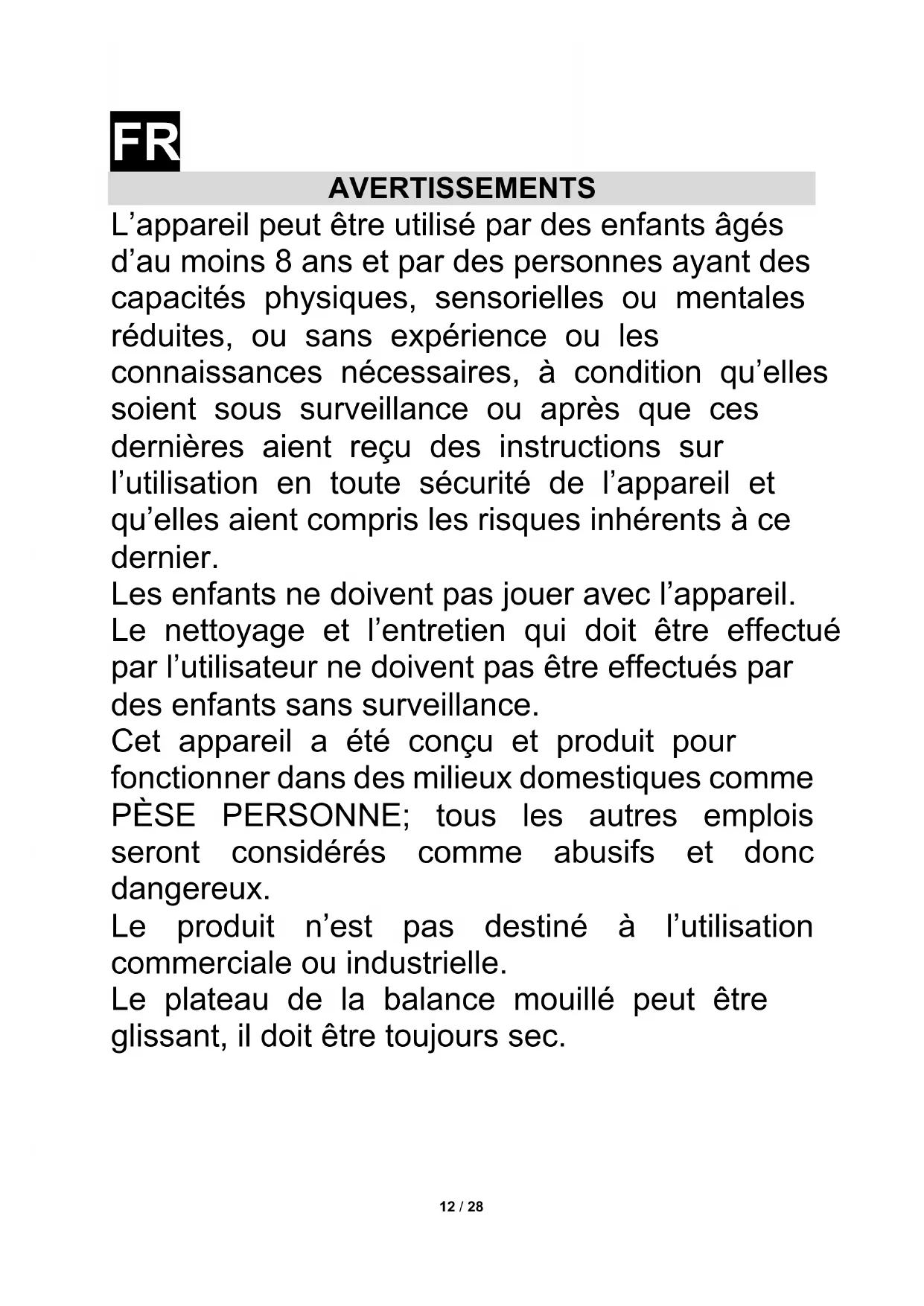 AVERTISSEMENTS L’appareil peut être utilisé par des enfants âgés d’au moins 8 ans et par des personnes ayant des capacités physiques, sensorielles ou mentales réduites, ou sans expérience ou les connaissances nécessaires, à condition qu’elles soient sous surveillance ou après que ces dernières aient reçu des instructions sur l’utilisation en toute sécurité de l’appareil et qu’elles aient compris les risques inhérents à ce dernier. Les enfants ne doivent pas jouer avec l’appareil. Le nettoyage et l’entretien qui doit être effectué par l’utilisateur ne doivent pas être effectués par des enfants sans surveillance. Cet appareil a été conçu et produit pour fonctionner dans des milieux domestiques comme PÈSE PERSONNE; tous les autres emplois seront considérés comme abusifs et donc dangereux. Le produit n’est pas destiné à l’utilisation commerciale ou industrielle. Le plateau de la balance mouillé peut être glissant, il doit être toujours sec.13 / 28