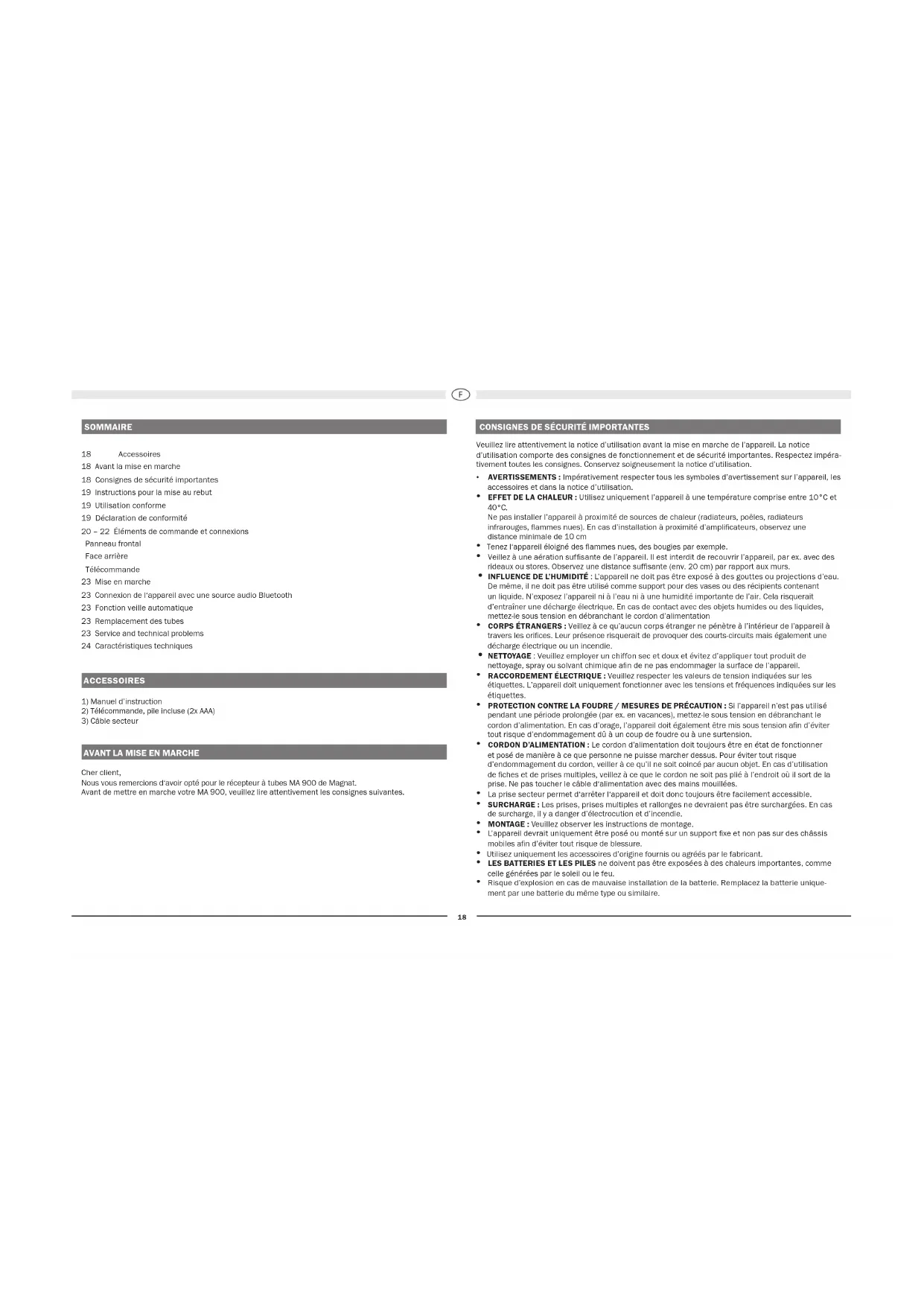 Cher client, Nous vous remercions d‘avoir opté pour le récepteur à tubes MA 900 de Magnat. Avant de mettre en marche votre MA 900, veuillez lire attentivement les consignes suivantes.
