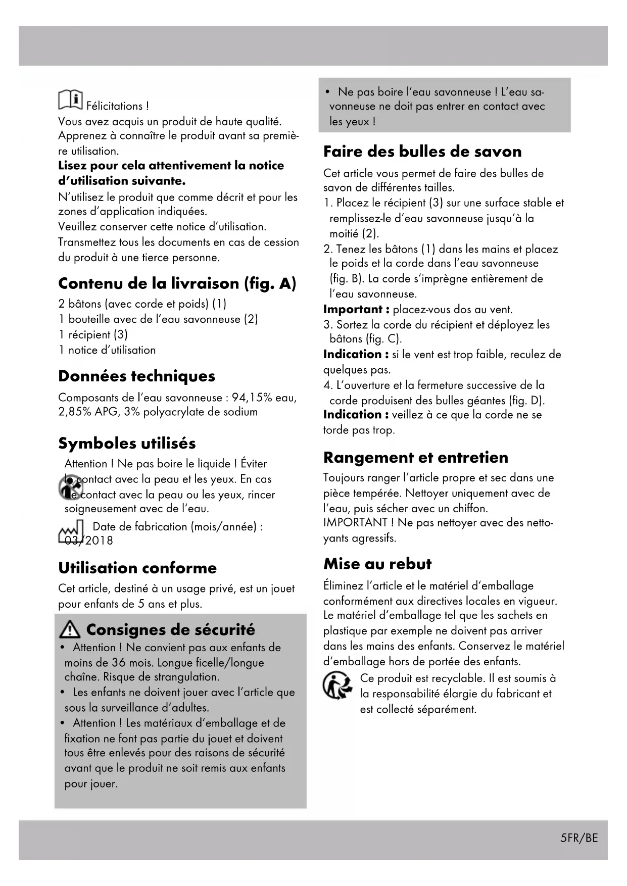 den sammen, kommer der gigantiske sæbebob- ler (afb. D). Bemærk: Sørg for, at snoren ikke er alt for snoet Pleje, opbevaring Opbevar altid artiklen tør og ren i et tempereret rum. Må kun rengøres med vand, og herefter tørres af med en rengøringsklud. VIGTIGT! Må aldrig rengøres med skrappe rengøringsmidler. Henvisninger vedr. bortskaffelse Bortskaf artikel og emballage i overensstemmelse med lokalt gældende forskrifter. Emballagema- terialer som f.eks. plastposer hører ikke hjemme i børnehænder. Opbevar emballagen utilgængeli- gt for børn. Servicehåndtering IAN: 297554 Service Danmark Tel.: 32 710005 E-Mail: deltasport@lidl.dk5FR/BE Félicitations ! Vous avez acquis un produit de haute qualité. Apprenez à connaître le produit avant sa premiè- re utilisation. Lisez pour cela attentivement la notice d’utilisation suivante. N’utilisez le produit que comme décrit et pour les zones d’application indiquées. Veuillez conserver cette notice d’utilisation. Transmettez tous les documents en cas de cession du produit à une tierce personne. Contenu de la livraison (fig. A) 2 bâtons (avec corde et poids) (1) 1 bouteille avec de l’eau savonneuse (2) 1 récipient (3) 1 notice d’utilisation Données techniques Composants de l‘eau savonneuse : 94,15% eau, 2,85% APG, 3% polyacrylate de sodium Symboles utilisés Attention ! Ne pas boire le liquide ! Éviter le contact avec la peau et les yeux. En cas de contact avec la peau ou les yeux, rincer soigneusement avec de l‘eau. Date de fabrication (mois/année) : 03/2018 Utilisation conforme Cet article, destiné à un usage privé, est un jouet pour enfants de 5 ans et plus. Consignes de sécurité