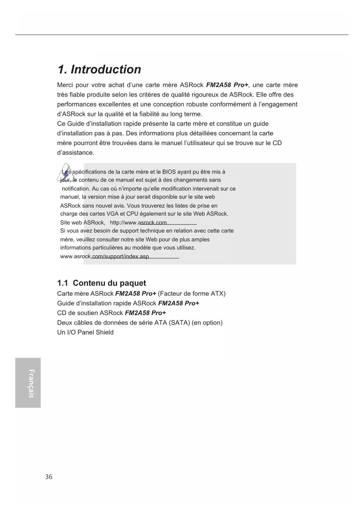 Merci pour votre achat d’une carte mère ASRock FM2A58 Pro+, une carte mère trèsableproduiteselonlescritèresdequalitérigoureuxdeASRock.Elleoffredes performances excellentes et une conception robuste conformément à l’engagement d’ASRocksurlaqualitéetlaabilitéaulongterme. Ce Guide d’installation rapide présente la carte mère et constitue un guide d’installation pas à pas. Des informations plus détaillées concernant la carte mère pourront être trouvées dans le manuel l’utilisateur qui se trouve sur le CD d’assistance. LesspécicationsdelacartemèreetleBIOSayantpuêtremisà jour, le contenu de ce manuel est sujet à des changements sans notication.Aucasoùn’importequ’ellemodicationintervenaitsurce manuel, la version mise à jour serait disponible sur le site web ASRock sans nouvel avis. Vous trouverez les listes de prise en charge des cartes VGA et CPU également sur le site Web ASRock. Site web ASRock, http://www.asrock.com Si vous avez besoin de support technique en relation avec cette carte mère, veuillez consulter notre site Web pour de plus amples informations particulières au modèle que vous utilisez. www.asrock.com/support/index.asp
