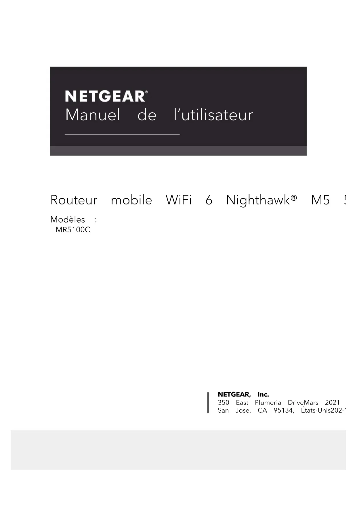 Manuel de l’utilisateur Routeur mobile WiFi 6 Nighthawk® M5 5G Modèles : MR5100C NETGEAR, Inc. 350 East Plumeria DriveMars 2021 San Jose, CA 95134, États-Unis202-12247-01Soutien et communauté Visitez www.netgear.com/support pour obtenir des réponses à vos questions et accéder aux plus récents téléchargements. Vous pouvez également vous référer à notre communauté NETGEAR pour profiter de conseils utiles à community.netgear.com. Information réglementaire et juridique Si ce produit est vendu au Canada, vous pouvez accéder à ce document en français canadien à https://www.netgear.com/support/download/ (Si ce produit est vendu au Canada, vous pouvez accéder à la version canadienne française de ce document à https://www.netgear.com/support/download/.) Pour obtenir des renseignements sur la conformité, y compris la déclaration de conformité de l’UE, visitez http://www.netgear.com/about/regulatory/. Consultez le document relatif à la conformité réglementaire avant de brancher le bloc d’alimentation. Pour connaître la politique de confidentialité de NETGEAR, visitez https://www.netgear.com/about/privacy-policy/. En utilisant cet appareil, vous acceptez les conditions d’utilisation de NETGEAR à https://www.netgear.com/about/terms-and-conditions. Si vous ne les acceptez pas, retournez votre appareil là où vous l’avez acheté durant la période prévue pour le retour. Marques de commerce © NETGEAR, Inc., NETGEAR et le logo NETGEAR sont des marques de commerce de NETGEAR, Inc. Toutes les autres marques de commerce sont utilisées à titre de référence uniquement.