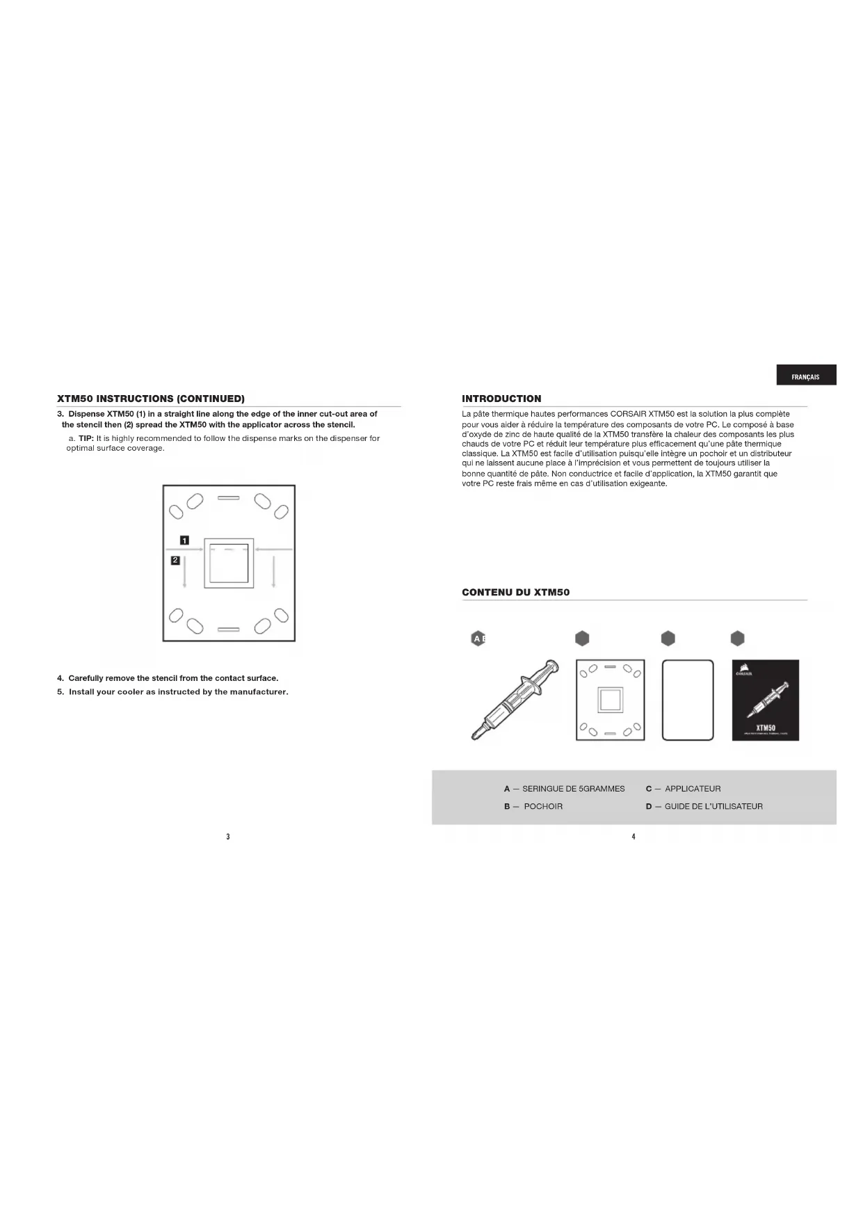 La pâte thermique hautes performances CORSAIR XTM50 est la solution la plus complète pour vous aider à réduire la température des composants de votre PC. Le composé à base d’oxyde de zinc de haute qualité de la XTM50 transfère la chaleur des composants les plus chauds de votre PC et réduit leur température plus efficacement qu’une pâte thermique classique. La XTM50 est facile d’utilisation puisqu’elle intègre un pochoir et un distributeur qui ne laissent aucune place à l’imprécision et vous permettent de toujours utiliser la bonne quantité de pâte. Non conductrice et facile d’application, la XTM50 garantit que votre PC reste frais même en cas d’utilisation exigeante. INTRODUCTION