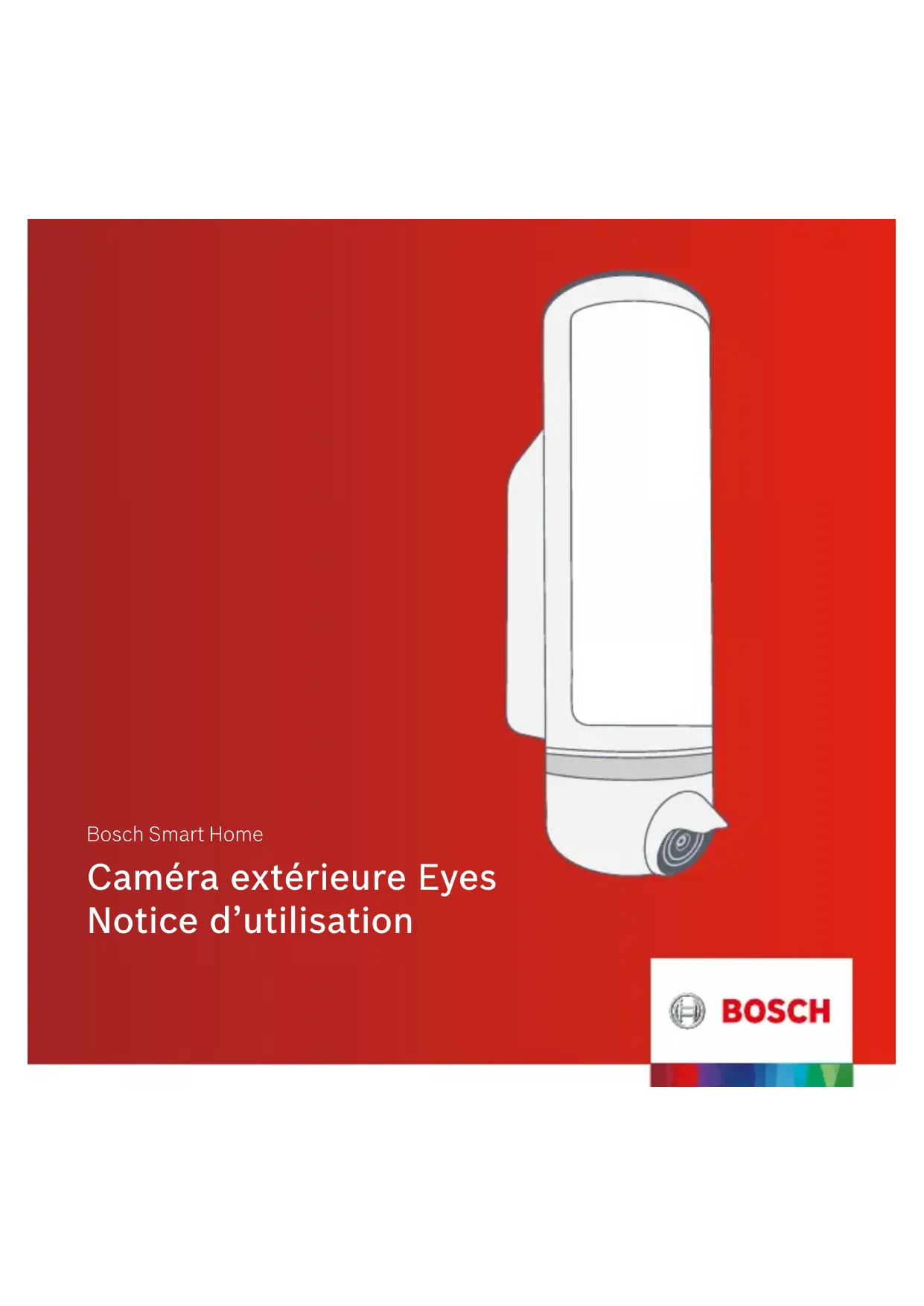 CODIC: 4341252Caméra extérieure Eyes Notice d’utilisation Bosch Smart HomeBienvenue dans votre maison intelligente ! Configurez votre produit en seulement 3 étapes ▶ Démarrez l’applica- tion Bosch Smart Cameras ▶ Montez la caméra extérieure Eyes et raccordez-la au secteur ▶ Mettez en service la caméra extérieure Eyes au moyen de l’application Bosch Smart Cameras Vous avez besoin de l’application Bosch Smart Cameras pour l’installation et la configuration de votre caméra extérieure Eyes Bosch Smart Home. Vous devez également disposer d’une connexion WiFi stable. Commencez par télécharger l’application Bosch Smart Cameras! Pour simplifier l’installation de votre caméra extérieure Eyes Bosch Smart Home, regardez la vidéo explicative sur notre site Internet: www.bosch-smarthome.com/installation5 Félicitations pour l’achat de cette caméra extérieure Eyes Bosch Smart Home. Elle va contribuer à rendre votre maison plus sûre et plus intelligente. Car la caméra extérieure Eyes détecte automatiquement les mouvements et se met alors à les enregistrer. Elle dispose par ailleurs d’une lampe permettant d’obtenir de bonnes images même la nuit. Grâce à l’application Bosch Smart Cameras, vous pouvez vérifier à tout moment, depuis n’importe où, si tout va bien à la maison. Nous vous souhaitons beaucoup de plaisir avec votre nouveau produit L’équipe Bosch Smart Home Chère cliente, cher client,6 7