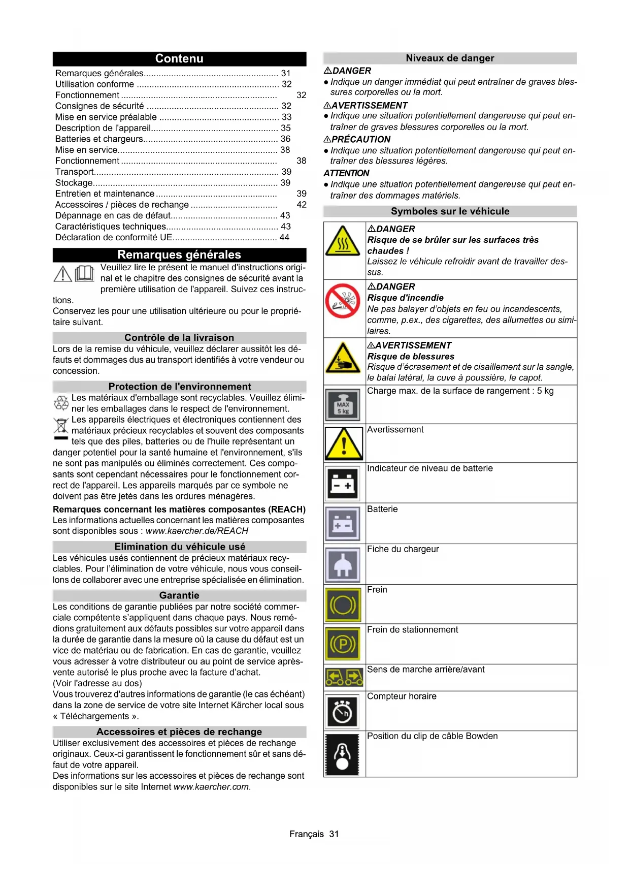 Consignes de sécurité Dispositifs de sécurité Les dispositifs de sécurité sont destinés à la protection de l’utili- sateur et ne doivent ni être mis hors service, ni shuntés. Observez les consignes de sécurité dans les chapitres ! Consignes de sécurité pour l’utilisation 몇 AVERTISSEMENT ● Utilisez l'appareil uniquement confor- mément à l’usage prévu. Respectez les conditions locales et por- tez attention aux tiers, en particulier aux enfants, lors de travaux avec l’appareil. ● Vérifiez le bon état et la sécurité du fonctionne- ment de l’appareil avec les dispositifs de travail. Ne l’utilisez pas s’il n’est pas en excellent état. ● Dans des zones dangereuses (p.ex. stations service), respectez les consignes de sécurité cor- respondantes. N'utilisez pas l'appareil dans des locaux à risque d'explosion. ● Cet appareil ne doit pas être utilisé par des per- sonnes dont les capacités physiques, sensorielles ou mentales Position de la clé Brancher/Débrancher Interrupteur à clé en position « OFF » Interrupteur à clé en position « ON » Flap pour déchets volumineux Nettoyage de filtre Remplacement du filtre Levage de la brosse-rouleau Abaissement de la brosse-rouleau Abaissement du balai latéral Levage du balai latéral Réglage du rétroviseur de balayage du balai latéral Déverrouillage de la commande de traction Verrouillage de la commande de traction Soufflerie arrêtée (opération de balayage humide) Soufflerie en marche (mode balayage) Point d'arrimageFrançais 33 sont réduites ou qui ne disposent pas de l’expérience et/ou des connaissances nécessaires. ● Seules les personnes instruites dans la manipulation de l’appareil ou ayant prouvé leurs compé- tences pour la commande et étant expressément chargées de son utilisation sont habilitées à utiliser l’appareil.ATTENTION ● L’opérateur doit vérifier, avant le début du travail, que tous les dispositifs de protection sont installés correctement et fonc- tionnent. ● L’opérateur de l’appareil est responsable des acci- dents avec d’autres personnes ou leur propriété.AVERTISSEMENT ● Veillez à ce que l’opérateur porte des vêtements près du corps et des chaussures solides. Eviter les vêtements trop lâches. ● Surveillez les enfants pour s’assu- rer qu’ils ne jouent pas avec l’appareil. ● Les enfants et les ado- lescents ne sont pas autorisés à utiliser l'appareil.ATTENTION ● Contrôler la zone à proximité avant de démarrer (p.ex. pré- sence d’enfants). Veillez à conserver une bonne vision ! ● Ne laisser jamais l'appareil sans surveillance tant qu'il est protégé contre tout mouvement involontaire. Lorsque l'appareil est à l'ar- rêt, serrer le frein de stationnement et retirer l'interrupteur à clé.PRÉCAUTION ● N’utilisez pas l’appareil dans des zones où réside la possibilité d’être touché par des chutes d’objets. Consignes de sécurité pour le mode traction Remarque ● La liste des risques de basculement n’est pas ex- haustive.DANGER ● Risque de basculement sur les grandes pentes en montée et descente ! Lors de conduite en montée ou en descente, respectez les valeurs maximales admissibles indi- quées dans les caractéristiques techniques. ● Risque de bascu- lement en cas d’inclinaison latérale trop forte ! Lors de conduite en travers du sens de la marche, respectez les valeurs maxi- males admissibles indiquées dans les caractéristiques tech- niques. ● Risque de basculement en cas de base instable ! Utilisez l'appareil uniquement sur une base consolidée. 몇 AVERTISSEMENT ● Risque d’accident dû à une vitesse non adaptée. Conduisez lentement dans les virages. Appareils entraînés par une batterie DANGER ● Risque d'explosion ! Chargez les batteries uni- quement avec un chargeur adapté ● La charge des batteries dans des espaces clos dégage un gaz très explosif. Chargez les batteries uniquement dans des espaces bien ventilés. ● Ne ma- nipulez pas de flammes, ne générez pas d’étincelles et ne fumez pas à proximité d’une batterie ou d’un espace de charge de bat- teries. ● Risque d’explosion et de court-circuit. Ne posez pas d’outil, ni d’objet similaire, sur la batterie. 몇 PRÉCAUTION ● Risque de blessure par l’acide de la batte- rie. Observez les consignes de sécurité correspondantes. ATTENTION ● Observez les consignes d’utilisation du fabricant de la batterie et du chargeur. Observez les recommandations du législateur en relation avec les batteries. ● Ne laissez jamais de batteries à l’état déchargé et chargez les batteries dès que pos- sible. ● Maintenez les batteries au propre et au sec pour éviter les courants de fuite. Protégez les batteries des impuretés dues, p.ex., à la poussière de métal. ● Eliminez les batteries usées dans le respect de l’environnement, conformément à la directive CE 91/157/EWG ou aux normes nationales en vigueur. Consignes de sécurité pour le transport 몇 PRÉCAUTION ● Lors du transport, observez le poids de l’appareil afin d’éviter les accidents e les blessures, voir chapitre Caractéristiques techniques dans le manuel d'instructions. ● Mettez le moteur à l’arrêt avant le transport. Fixez l’appareil en tenant compte de son poids, voir chapitre Caractéristiques techniques dans le manuel d'utilisation. Entretien et maintenance 몇 AVERTISSEMENT ● Débranchez la batterie avant les tra- vaux sur l’installation électrique. ● Avant de nettoyer, d'entretenir, de remplacer des pièces ou de changer de fonction, désactiver l'appareil et retirer l'interrupteur à clé. 몇 PRÉCAUTION ● Faites réaliser les réparations uniquement par le point de service après-vente autorisé ou par des spécia- listes du domaine familiarisés avec toutes les consignes de sécu- rité importantes. ATTENTION ● Pour les appareils professionnels utilisés sur dif- férents sites, obs