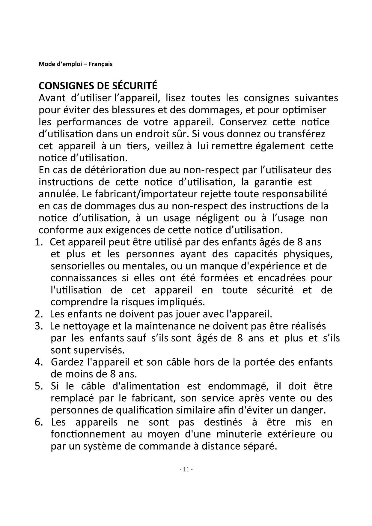 Avant d’utiliser l’appareil, lisez toutes les consignes suivantes pour éviter des blessures et des dommages, et pour optimiser les performances de votre appareil. Conservez cette notice d’utilisation dans un endroit sûr. Si vous donnez ou transférez cet appareil à un tiers, veillez à lui remettre également cette notice d’utilisation. En cas de détérioration due au non-respect par l’utilisateur des instructions de cette notice d’utilisation, la garantie est annulée. Le fabricant/importateur rejette toute responsabilité en cas de dommages dus au non-respect des instructions de la notice d’utilisation, à un usage négligent ou à l’usage non conforme aux exigences de cette notice d’utilisation.