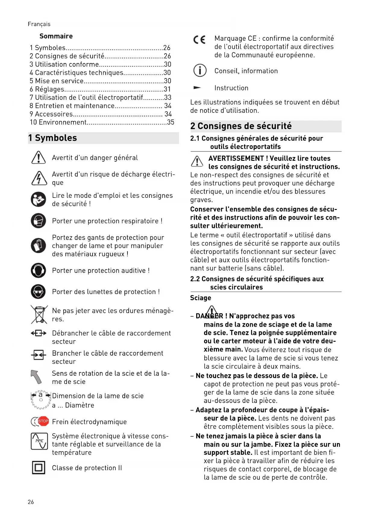 - 10 Environnement 1 Symboles Avertit d'un danger général Avertit d'un risque de décharge électri que Lire le mode d'emploi et les consignes de sécurité ! Porter une protection respiratoire ! Portez des gants de protection pour changer de lame et pour manipuler des matériaux rugueux ! Porter une protection auditive ! Porter des lunettes de protection ! Ne pas jeter avec les ordures ménagè res. Débrancher le câble de raccordement secteur Brancher le câble de raccordement secteur Sens de rotation de la scie et de la la me de scie Dimension de la lame de scie a Diamètre STOP Frein électrodynamique Système électronique à vitesse cons tante réglable et surveillance de la température Classe de protection II Marquage CE : confirme la conformité de l'outil électroportatif aux directives de la Communauté européenne. Conseil, information Instruction Les illustrations indiquées se trouvent en début de notice d'utilisation. 2 Consignes de sécurité p. 35