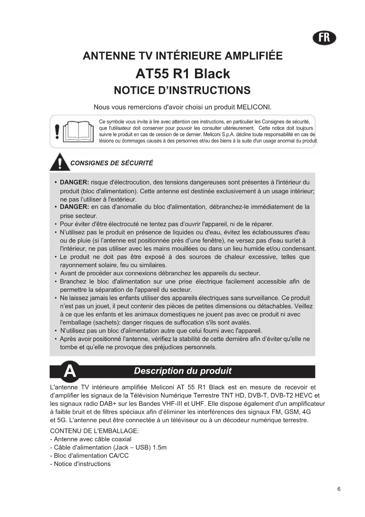 Nous vous remercions d'avoir choisi un produit MELICONI. L'antenne TV intérieure ampliée Meliconi AT 55 R1 Black est en mesure de recevoir et d’amplier les signaux de la Télévision Numérique Terrestre TNT HD, DVB-T, DVB-T2 HEVC et les signaux radio DAB+ sur les Bandes VHF-III et UHF. Elle dispose également d'un amplicateur à faible bruit et de ltres spéciaux an d’éliminer les interférences des signaux FM, GSM, 4G et 5G. L'antenne peut être connectée à un téléviseur ou à un décodeur numérique terrestre.CONTENU DE L'EMBALLAGE:- Antenne avec câble coaxial- Câble d'alimentation (Jack – USB) 1.5m- Bloc d'alimentation CA/CC - Notice d'instructions