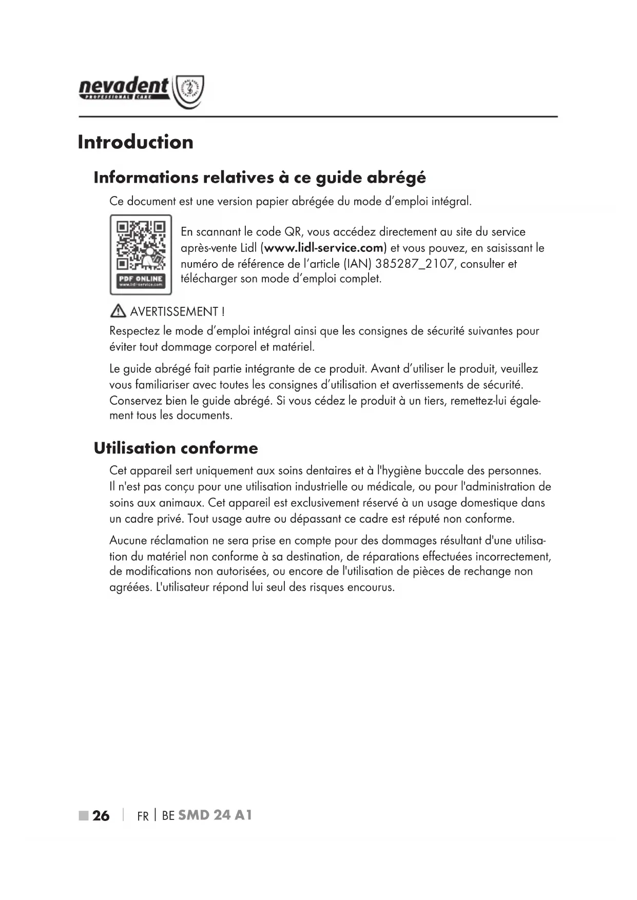 Introduction Informations relatives à ce guide abrégé Ce document est une version papier abrégée du mode d’emploi intégral. En scannant le code QR, vous accédez directement au site du service après-vente Lidl (www.lidl-service.com) et vous pouvez, en saisissant le numéro de référence de l‘article (IAN) 385287_2107, consulter et télécharger son mode d‘emploi complet. AVERTISSEMENT ! Respectez le mode d’emploi intégral ainsi que les consignes de sécurité suivantes pour éviter tout dommage corporel et matériel. Le guide abrégé fait partie intégrante de ce produit. Avant d’utiliser le produit, veuillez vous familiariser avec toutes les consignes d’utilisation et avertissements de sécurité. Conservez bien le guide abrégé. Si vous cédez le produit à un tiers, remettez-lui égale- ment tous les documents. Utilisation conforme Cet appareil sert uniquement aux soins dentaires et à l'hygiène buccale des personnes. Il n'est pas conçu pour une utilisation industrielle ou médicale, ou pour l'administration de soins aux animaux. Cet appareil est exclusivement réservé à un usage domestique dans un cadre privé. Tout usage autre ou dépassant ce cadre est réputé non conforme. Aucune réclamation ne sera prise en compte pour des dommages résultant d'une utilisa- tion du matériel non conforme à sa destination, de réparations effectuées incorrectement, de modifications non autorisées, ou encore de l'utilisation de pièces de rechange non agréées. L'utilisateur répond lui seul des risques encourus. IB_385287_SMD24A1_LB8-short.indb 26IB_385287_SMD24A1_LB8-short.indb 26 27.10.2021 11:36:5127.10.2021 11:36:51FR