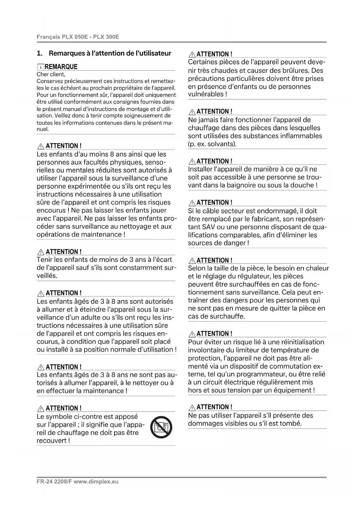 Cher client, Conservez précieusement ces instructions et remettez- les le cas échéant au prochain propriétaire de l’appareil. Pour un fonctionnement sûr, l’appareil doit uniquement être utilisé conformément aux consignes fournies dans le présent manuel d’instructions de montage et d’utili- sation. Veillez donc à tenir compte soigneusement de toutes les informations contenues dans le présent ma- nuel. ATTENTION ! Les enfants d’au moins 8 ans ainsi que les personnes aux facultés physiques, senso- rielles ou mentales réduites sont autorisés à utiliser l’appareil sous la surveillance d’une personne expérimentée ou s’ils ont reçu les instructions nécessaires à une utilisation sûre de l’appareil et ont compris les risques encourus ! Ne pas laisser les enfants jouer avec l’appareil. Ne pas laisser les enfants pro- céder sans surveillance au nettoyage et aux opérations de maintenance ! ATTENTION ! Tenir les enfants de moins de 3 ans à l’écart de l’appareil sauf s’ils sont constamment sur- veillés. ATTENTION ! Les enfants âgés de 3 à 8 ans sont autorisés à allumer et à éteindre l’appareil sous la sur- veillance d’un adulte ou s’ils ont reçu les ins- tructions nécessaires à une utilisation sûre de l’appareil et ont compris les risques en- courus, à condition que l’appareil soit placé ou installé à sa position normale d’utilisation ! ATTENTION ! Les enfants âgés de 3 à 8 ans ne sont pas au- torisés à allumer l’appareil, à le nettoyer ou à en effectuer la maintenance ! ATTENTION ! Le symbole ci-contre est apposé sur l’appareil ; il signifie que l’appa- reil de chauffage ne doit pas être recouvert ! ATTENTION ! Certaines pièces de l’appareil peuvent deve- nir très chaudes et causer des brûlures. Des précautions particulières doivent être prises en présence d’enfants ou de personnes vulnérables ! ATTENTION ! Ne jamais faire fonctionner l’appareil de chauffage dans des pièces dans lesquelles sont utilisées des substances inflammables (p. ex. solvants). ATTENTION ! Installer l’appareil de manière à ce qu’il ne soit pas accessible à une personne se trou- vant dans la baignoire ou sous la douche ! ATTENTION ! Si le câble secteur est endommagé, il doit être remplacé par le fabricant, son représen- tant SAV ou une personne disposant de qua- lifications comparables, afin d’éliminer les sources de danger ! ATTENTION ! Selon la taille de la pièce, le besoin en chaleur et le réglage du régulateur, les pièces peuvent être surchauffées en cas de fonc- tionnement sans surveillance. Cela peut en- traîner des dangers pour les personnes qui ne sont pas en mesure de quitter la pièce en cas de surchauffe. ATTENTION ! Pour éviter un risque lié à une réinitialisation involontaire du limiteur de température de protection, l’appareil ne doit pas être ali- menté via un dispositif de commutation ex- terne, tel qu’un programmateur, ou être relié à un circuit électrique régulièrement mis hors et sous tension par un équipement ! ATTENTION ! Ne pas utiliser l’appareil s’il présente des dommages visibles ou s’il est tombé.www.dimplex.eu 2208/F FR-25 PLX 050E - PLX 300E Français ATTENTION ! Si l’appareil se déclenche automatiquement sans surveillance, des dangers peuvent survenir : les appareils p. ex. recouverts ou déplacés entre-temps peuvent provoquer des incendies ! REMARQUE