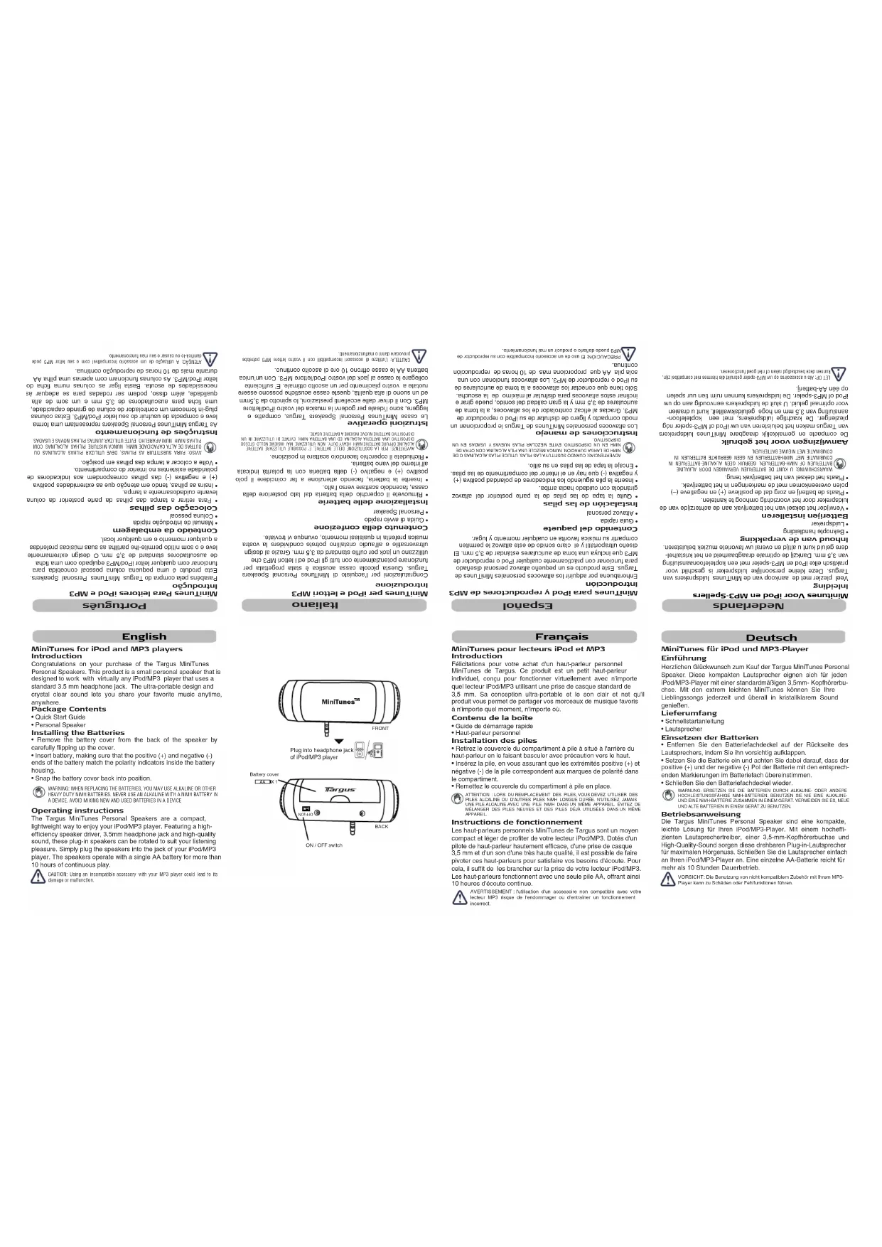 - Remettez le couvercle du compartiment à pile en place. ATTENTION : LORS DU REMPLACEMENT DES PILES, VOUS DEVEZ UTILISER DES PILES ALCALINE OU D'AUTRES PILES NiMH LONGUE DURÉE. N'UTILISEZ JAMAIS UNE PILE ALCALINE AVEC UNE PILE NiMH DANS UN MÊME APPAREIL. ÉVITEZ DE MÉLANGER DES PILES NEUVES ET DES PILES DÉJÀ UTILISÉES DANS UN MÊME APPAREIL. Instructions de fonctionnement Les haut-parleurs personnels MiniTunes de Targus sont un moyen compact et léger de profiter de votre lecteur iPod/MP3. Dotés d'un pilote de haut-parleur hautement efficace, d'une prise de casque 3,5 mm et d'un son d'une très haute qualité, il est possible de faire pivoter ces haut-parleurs pour satisfaire vos besoins d'écoute. Pour cela, il suffit de les brancher sur la prise de votre lecteur iPod/MP3. Les haut-parleurs fonctionnent avec une seule pile AA, offrant ainsi 10 heures d'écoute continue. AVERTISSEMENT : l'utilisation d'un accessoire non compatible avec votre lecteur MP3 risque de l'endommager ou d'entraîner un fonctionnement incorrect. MiniTunes para iPod y reproductores de MP3 Introducción Enhorabuena por adquirir los altavoces personales MiniTunes de Targus. Este producto es un pequeño altavoz personal diseñado para funcionar con prácticamente cualquier iPod o reproductor de MP3 que incluya una toma de auriculares estándar de 3,5 mm. El diseño ultraportátil y el claro sonido de este altavoz le permiten compartir su música favorita en cualquier momento y lugar. Contenido del paquete