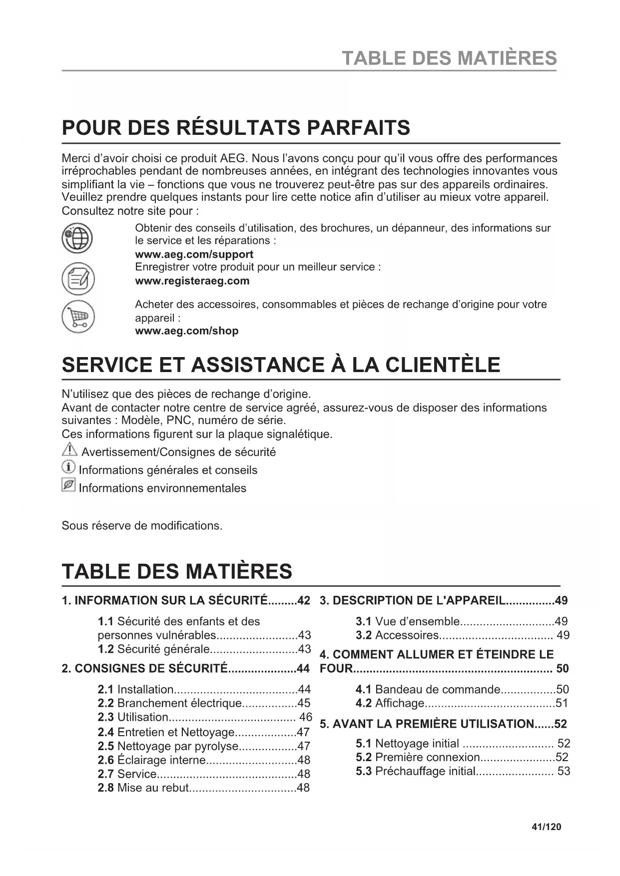 Recycleer de materialen met het symbool . Gooi de verpakking in een geschikte afvalcontainer om het te recycleren. Bescherm het milieu en de volksgezondheid en recycleer op een correcte manier het afval van elektrische en elektronische apparaten. Gooi apparaten gemarkeerd met het symbool niet weg met het huishoudelijk afval. Breng het product naar het milieustation bij u in de buurt of neem contact op met de gemeente. 40/120 DOE HET OP EEN SNELLERE MANIER!POUR DES RÉSULTATS PARFAITS Merci d’avoir choisi ce produit AEG. Nous l’avons conçu pour qu’il vous offre des performances irréprochables pendant de nombreuses années, en intégrant des technologies innovantes vous simplifiant la vie – fonctions que vous ne trouverez peut-être pas sur des appareils ordinaires. Veuillez prendre quelques instants pour lire cette notice afin d’utiliser au mieux votre appareil. Consultez notre site pour : Obtenir des conseils d’utilisation, des brochures, un dépanneur, des informations sur le service et les réparations : www.aeg.com/support Enregistrer votre produit pour un meilleur service : www.registeraeg.com Acheter des accessoires, consommables et pièces de rechange d’origine pour votre appareil : www.aeg.com/shop