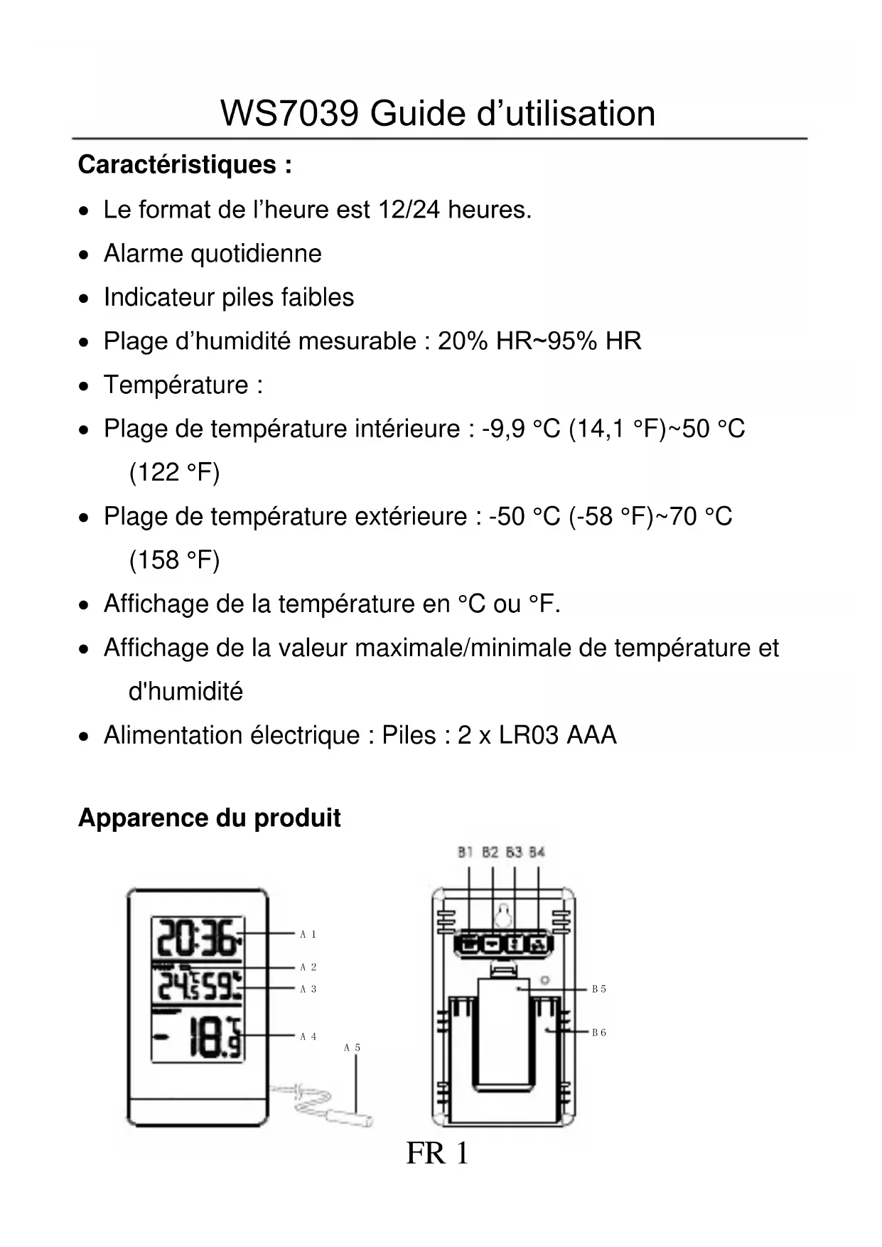B6FR 2 Partie A – Affichage LCD A1 : Heure A2 : Indicateur piles faibles A3 : Température et humidité intérieures A4 : Température extérieure A5 : Capteur de température extérieure Partie B – Touches à l’arrière B1 : Touche MODE/SET (Mode/Réglage) B2 : Touche «MEM» B3 : Touche «+/ » B4 : Touche «-/°C/°F» B5 : couvercle du compartiment à piles B6 : Support Mise en marche : Ouvrez le couvercle du compartiment à piles Insérez 2 piles AAA en respectant les polarités [marques «+» et «-»] Lorsque vous insérez les piles, tous les icônes de l'écran LCD s’allument pendant 3 secondes, un bip sera émis et la station détecte la température et l'humidité intérieures.FR 3 Modes d'affichage Appuyez une fois sur la touche «MODE» pour basculer entre l'affichage de l’heure et du jour. Appuyez une autre fois sur la touche «MODE» pour passer à l'affichage de l'heure d'alarme. Réglage manuel de l'heure En mode affichage de l'heure, maintenez appuyée la touche «MODE» pendant 2 secondes, 12/24H se met à clignoter. Utilisez les touches «+» et «-» pour basculer entre les modes 12 et 24 heures. Appuyez sur «MODE» pour confirmer votre réglage, les heures se mettent à clignoter. Utilisez les touches «+» et «-» pour régler les heures. Appuyez sur «MODE» pour confirmer votre réglage, les minutes se mettent à clignoter. Utilisez les touches «+» et «-» pour régler les minutes. Appuyez sur «MODE» pour confirmer votre réglage et terminer la procédure de réglage. Remarque : Si au bout de 20 secondes, il n'y a aucune opération valide, la station retourne automatiquement à l’affichage de l'heure.FR 4