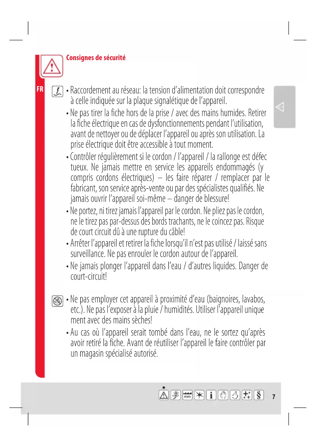 - Au cas où l’appareil serait tombé dans l’eau, ne le sortez qu’après avoir retiré la fiche. Avant de réutiliser l’appareil le faire contrôler par un magasin spécialisé autorisé.