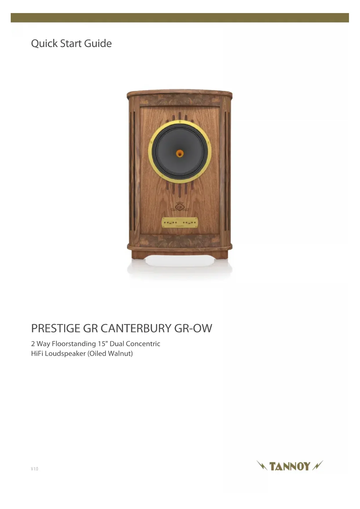 ‘EARTH’ CONNECTION ON AMPLIFIER (OPTIONAL) LINKS REMOVED TO RIGHT SPEAKER La bi-amplication étend encore le principe du bi-câblage. Dans cette option de connexion, des amplicateurs de puissance séparés sont utilisés pour les signaux graves et aigus dans chaque haut-parleur. Quatre amplicateurs mono (ou deux stéréo) du même type sont nécessaires pour une paire d'enceintes stéréo. Si deux amplicateurs stéréo sont utilisés, il est recommandé qu'un amplicateur fournisse des informations sur les graves aux haut-parleurs gauche et droit et l'autre, les informations sur les aigus. Il est important de ne pas utiliser les câbles de liaison sur le bornier, sous peine d'endommager l'amplicateur. Réglage des aigus Chaque enceinte est équipée de deux commandes situées sur le déecteur avant sous la grille amovible. Ces blocs de commutation à courant élevé sont étiquetés ROLL OFF et ENERGY. Ils peuvent être utilisés pour compenser les caractéristiques acoustiques variées des salles d'écoute. Les commandes doivent être réglées avec les commandes de tonalité de l'amplicateur en position « plate » ou non compensée. Chaque haut- parleur doit être réglé individuellement. La rotation de la commande de balance de l'amplicateur, pour sélectionner d'abord une enceinte puis l'autre, y parvient le plus facilement. Le contrôle de l'énergie a cinq positions. Il permet d'augmenter ou de diminuer la sortie de l'unité d'entraînement à compression haute fréquence à partir de la position linéaire ou « plate » sur une bande de fréquence d'environ 1 kHz à 27 kHz. La commande Roll O a cinq positions (+2, niveau, -2, -4 et -6 dB par octave) et permet un réglage à des fréquences extrêmement élevées de 5 kHz à 30 kHz. La commande Energy a un eet de plateau tandis que la commande roll o augmente ou diminue la pente de la réponse en fréquence extrêmement élevée. La réponse la plus plate et la plus linéaire du haut-parleur sera obtenue avec les deux commandes réglées sur la position LEVEL, et cette position doit être utilisée pour les premiers tests d'écoute. Si la qualité globale du son à haute fréquence semble trop importante, les positions –1,5 ou –3 pour la commande d'énergie doivent être essayées. Si le son semble tamisé dans la région des aigus, les réglages +1,5 ou +3 peuvent être préférés. Une fois le réglage du contrôle de l'énergie établi, le contrôle Roll O peut être ajusté pour réduire ou augmenter légèrement le contenu des fréquences extrêmement hautes si nécessaire. N'oubliez pas que les modications qui peuvent être apportées en déplaçant l'une ou l'autre des commandes d'une position à une autre sont subtiles. Ils peuvent ne pas être facilement entendus si le contenu du programme a très peu de contenu dans la bande de fréquences considérée. Choisissez un morceau de musique bien équilibré avec un spectre sonore complet. Le réglage correct sera trouvé lorsque les haut- parleurs ne seront plus visibles et que seule la performance musicale sera entendue. Entretien de l'armoire L'armoire est nie selon des normes rigoureuses en utilisant des moulures en bois dur soigneusement sélectionnées et des placages en bois véritable assortis. Le bois ne doit être nettoyé qu'avec un chion sec ou avec une légère application de polish pour meubles de qualité sans silicone comme la cire spécialisée Tannoy fournie dans le pack d'accessoires. Veillez à ne pas faire polir le tissu de la calandre ou le déecteur avant laqué. Comme pour tous les meubles en bois massif, l'exposition à des températures extrêmes, au froid et à une humidité variable entraînera un léger assouplissement du bois. Par conséquent, il est recommandé de protéger le haut-parleur des conditions environnementales extrêmes an de se prémunir contre de tels événements. Tout bois changera de couleur lorsqu'il sera soumis à la teneur en UV de la lumière ambiante et se dessèchera avec le temps, d'où la nécessité de «nourrir» le bois avec la cire fournie périodiquement. Retrait de la grille Un tissu spécial acoustiquement transparent est utilisé dans les grilles. Cependant, pour une délité ultime, l'amateur trouvera qu'il est préférable d'utiliser ces haut-parleurs avec leurs grilles retirées lors de l'écoute. Le retrait de la grille est également nécessaire pour accéder aux commandes du panneau avant. La grille avant se retire à l'aide de la clé fournie. Tournez la clé dans la fente pour clé et retirez le bas de la grille de l'armoire. La grille tombera de son emplacement supérieur. Veillez à ne pas endommager la partie inférieure en bois du meuble. Pour remplacer la grille, engagez le haut de la grille dans la fente du boîtier et poussez la grille dans le renfoncement et verrouillez-la en position.32 33Quick Start GuidePRESTIGE GR CANTERBURY GR-OW Einführung Musik ist eine Kunstform, die in all ihrer Schönheit, Detailtreue und Nuance erlebt werden muss, ohne die geringste Färbung, die sofort von ihrer reinsten Essenz ablenken kann. Ein wirklich großartiges Lautsprecherdesign ermöglicht es dem Lautsprechersystem, sich aus der Klanglandschaft zu entfernen und die Musik so zu präsentieren, dass Sie wie bei einer Live-Performance umhüllt werden. In den 1970er Jahren entwickelte Tannoy eine Reihe von Monitoren, die die Art und Weise, wie Studioingenieure und Audiophile gleichermaßen hochwertige Audioqualität erleben wollten, für immer veränderten. Die Tannoy HPD-Serie wurde schnell zu einem der beliebtesten Hi-Fi-Lautsprecher aller Zeiten. Der CANTERBURY Dual Concentric Hi-Fi-Lautsprecher ist mehr als nur eine Hommage an seinen Vorgänger und hebt das Erbe der Tannoy HPD außergewöhnlich transparenter Leistung durch die Implementierung neuer, hochskalierter Treiber und Komponenten weiter hervor – eine Technologie, die zu dieser Zeit nicht verfügbar war. Einfach ausgedrückt, bietet die CANTERB