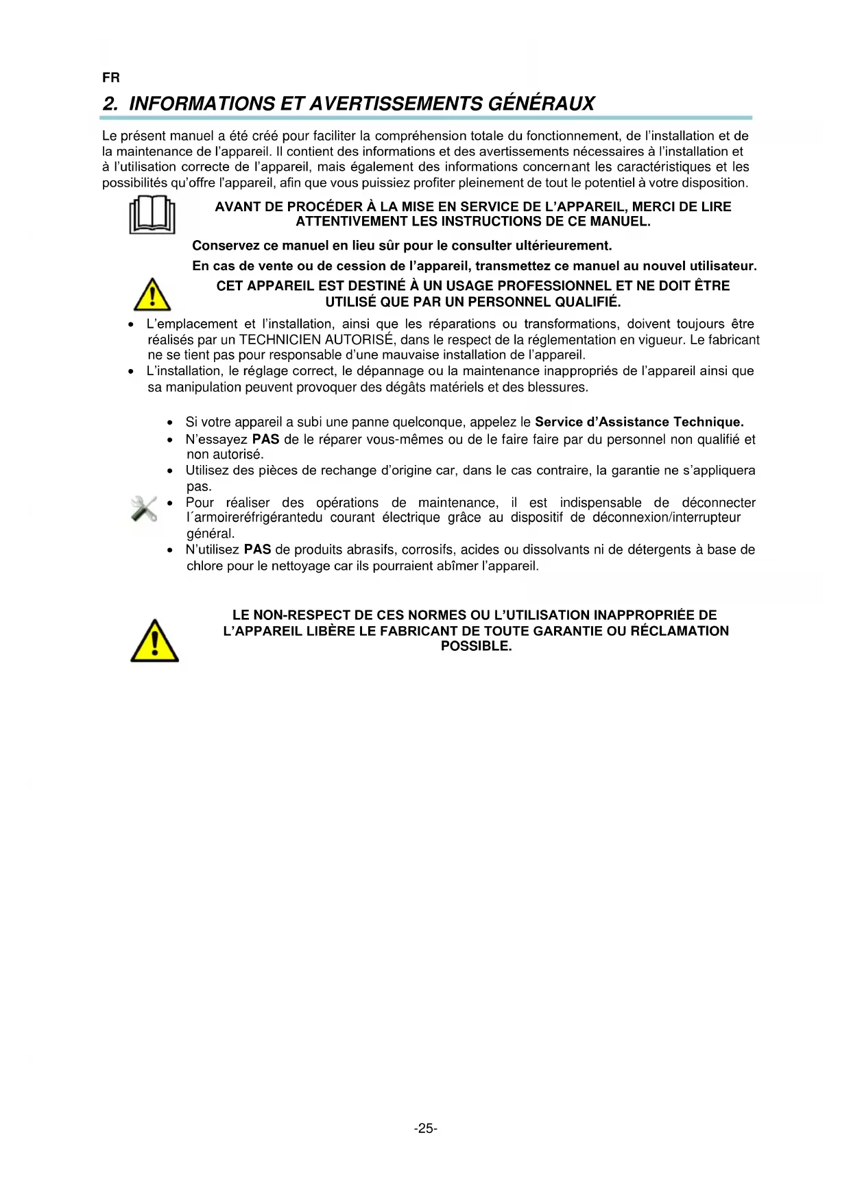- Sur les armoires négatives, un dégivrage de deux heures après la mise en marche est prévu.
