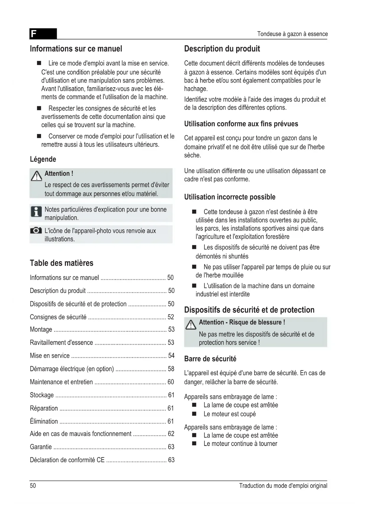 - Déclaration de conformité CE Informations sur ce manuel Lire ce mode d'emploi avant la mise en service. C'est une condition préalable pour une sécurité d'utilisation et une manipulation sans problèmes. Avant l'utilisation, familiarisez-vous avec les élé- ments de commande et l'utilisation de la machine. Respecter les consignes de sécurité et les avertissements de cette documentation ainsi que celles qui se trouvent sur la machine. Conserver ce mode d'emploi pour l'utilisation et le remettre aussi à tous les utilisateurs ultérieurs. Légende Attention ! Le respect de ces avertissements permet d'éviter tout dommage aux personnes et/ou matériel. Notes particulières d'explication pour une bonne manipulation. L'icône de l'appareil-photo vous renvoie aux illustrations. Description du produit Cette document décrit différents modèles de tondeuses à gazon à essence. Certains modèles sont équipés d'un bac à herbe et/ou sont également compatibles pour le hachage. Identiez votre modèle à l'aide des images du produit et de la description des différentes options. Utilisation conforme aux ns prévues Cet appareil est conçu pour tondre un gazon dans le domaine privatif et ne doit être utilisé que sur de l'herbe sèche. Une utilisation différente ou une utilisation dépassant ce cadre n'est pas conforme. Utilisation incorrecte possible Cette tondeuse à gazon n'est destinée à être utilisée dans les installations ouvertes au public, les parcs, les installations sportives ainsi que dans l'agriculture et l'exploitation forestière Les dispositifs de sécurité ne doivent pas être démontés ni shuntés Ne pas utiliser l'appareil par temps de pluie ou sur de l'herbe mouillée L'utilisation de la machine dans un domaine industriel est interdite Dispositifs de sécurité et de protection Attention - Risque de blessure ! Ne pas mettre les dispositifs de sécurité et de protection hors service ! Barre de sécurité L'appareil est équipé d'une barre de sécurité. En cas de danger, relâcher la barre de sécurité. Appareils sans embrayage de lame : La lame de coupe est arrêtée Le moteur est coupé Appareils sans embrayage de lame : La lame de coupe est arrêtée Le moteur continue à tournerF 51470 591_c 1 Câble de démarrage 9 Réglage de la hauteur de coupe* 2 Départ, Arrêt* 10 Embrayage de lame* 3 Transmission roues* 11 Transmission Vario 4 Barre de sécurité 12 Notice d'instruction 5 Réglage de la hauteur ergonomique* 13 Insert d'éjection* 6 Indicateur de niveau* 14 Volet de fermeture* 7 Volet déecteur* 15 Kit de hachage* 8 Bac à herbe* * selon le modèle Symboles sur la machine Attention ! Faire preuve d'un maximum de précautions lors de la manipulation. Avant d'intervenir sur l'outil de coupe, retirer la cosse de bougie d'allumage. Avant la mise en service, lire le mode d'emploi ! Desserrer le frein moteur. Les tiers doivent être tenus hors de la zone dangereuse ! Enclencher la transmission roues. Maintenir les mains et les pieds loin de l'outil de coupe ! p. 63